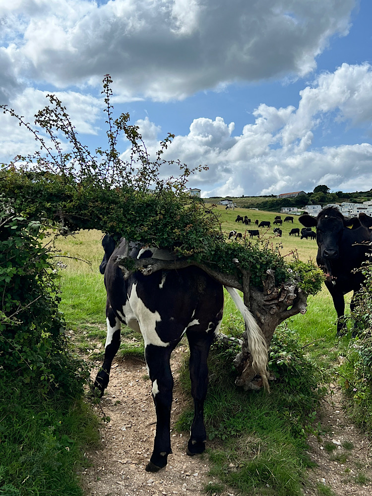 Achso, der Weißdorn. Das ist ja hier so eine Art Nationalpflanze. Jede Landstraße, jedes Feld, jeder Garten ist damit umgrenzt und die Mär sagt, dass der Zauberer Merlin, als er von der Fee Viviane verzaubert wurde unter einem Weißdorn eingeschlafen sei. Noch heute schläft er dort bis zum Ende aller Zeiten. Zauberstäbe werden aus Weißdorn gefertigt, Herztinkturen erstellt… und was machen diese Kühe hier voll Genuss? … ja auch dafür ist der Weißdorn anscheinend gut geeignet.