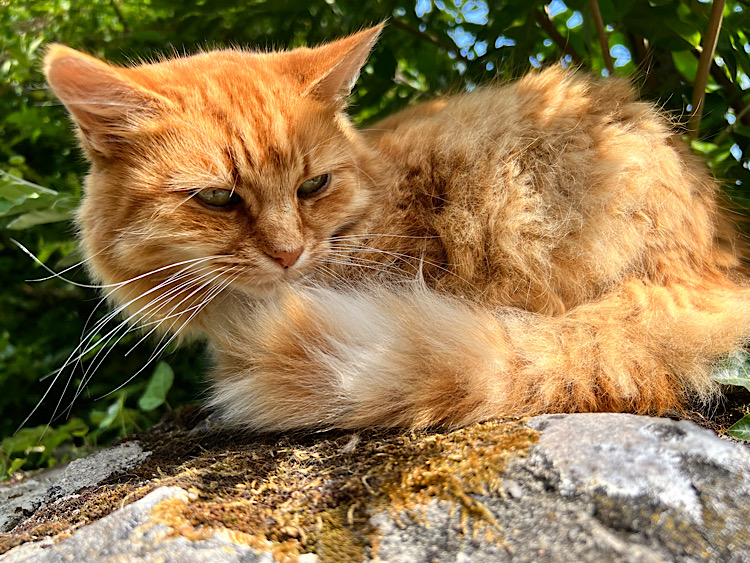 Beim Bäcker kaufe ich noch ein leckeres Brot und setze mich dann für einen Kaffee an die Promenade. Sally setzt sich dazu. Eine Frau in meinem Alter, hier aus der Gegend und Kindergärtnerin. Heute hat sie frei und gönnt sich eine Auszeit am Strand. Wir schwatzen über Hunde, die Kinder, die wir in unserer beruflichen Obhut haben, das Reisen und das Leben. Herrlich. Lunchen liegt brav dabei und hofft auf einen Krümel von Sallys Streuselschnecke. Auf dem Rückweg zu unserem Womo treffen wir noch dieses wunderschöne Tierchen und nun ratet mal, wen der Katzenblick hier gerade fixiert.