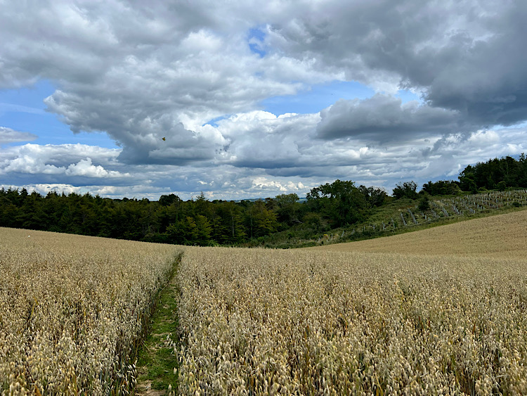 Auf der anderen Seite wandert man entspannt über Wiesen und kann nach dem Aufstieg erst einmal durchatmen. Ich fühle mich an den Familienausflug von Spitzweg erinnert. Den zeige ich meinen Schülern immer, wenn es um Biedermeier geht, also sagen wir ruhig: bürgerliche Spießigkeit. Aber nun bin ich selbst so eine. Ich mag das einfach: alles friedlich und weit weg von allem Ärger. Und das bestätigen mir auch zwei Briten meines Alters. Ein Ehepaar mit Hund, wir kommen – wie sollte es hier auch anders sein – ins Gespräch. Ah Jena, das kennt er, die Objektive, na klar. Außerdem hatte er mal beruflich mit Oberkochen zu tun. Und er erzählt sogar die Geschichte von den LKWs, die nach dem Krieg in Jena mit den wichtigsten Sachen losgefahren sind, gen Westen. Dort wo der Sprit alle war – in Oberkochen auf der grünen Wiese – wurde das neue Werk gebaut. 😉 Die Story kannte. Ja und beide bestätigen, dass sie auch nichts weiter brauchen als ihren CamperVan, Natur, Ruhe und den Hund. Spießer eben…