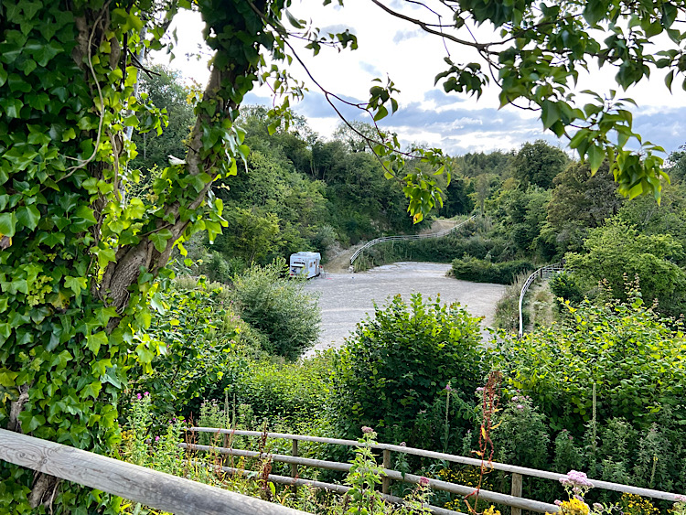 Nun ist es nicht mehr weit bis zurück zum Parkplatz, doch auf dem letzten Stück versuche ich dann noch eine Abkürzung, was ja meistens schief geht, so auch heute. Es wird steil, brennnesselig, brombeerdicht und anstrengend, aber wir kommen gegen 16:30 Uhr am Ausgangspunkt an. Hat der Parkplatz eigentlich ein Tor? Gerade sehe ich ein kleine grünes Auto herauskommen – prima, dann ist ja noch geöffnet! Doch als wir ankommen sehen wir das: