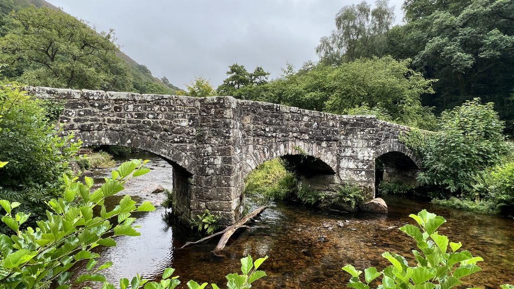 Der Regen ist auszuhalten und auch die Windböen lassen im Tal nach. Die Heide blüht und von den wilden Ponys sehen wir zumindest das, was sie zurückgelassen haben. Unten angekommen, kann ich die alte Fingle Bridge mit angeschlossenem Pub bewundern.