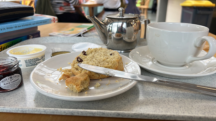 Eigentlich brauche ich nur Strom. Der Rest hält noch ein bisschen. Deshalb setze ich mich ins National-Trust-Cafe am Castle, gönne mir einen Cream Tea – das hier so übliche „Frauen-Gedeck“ (siehe Bild) – lade meine elektrischen Geräte und schreibe diese Zeilen.