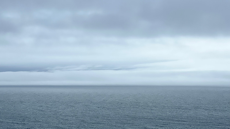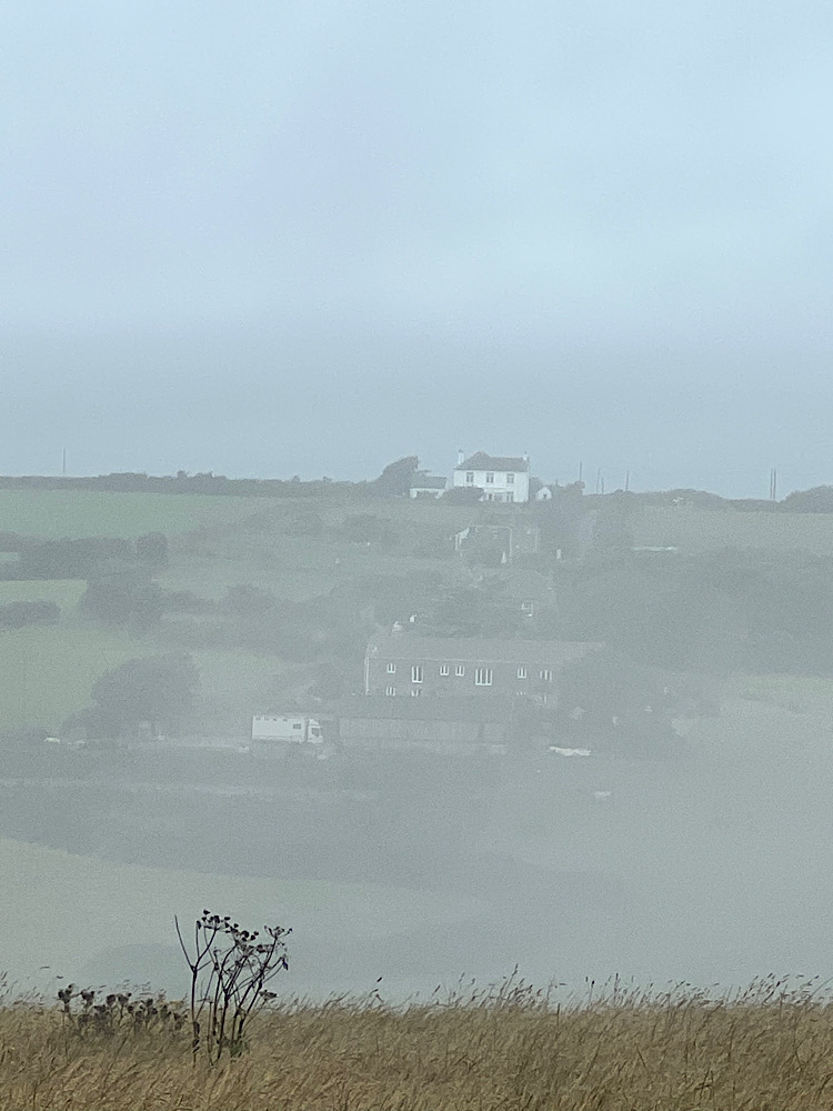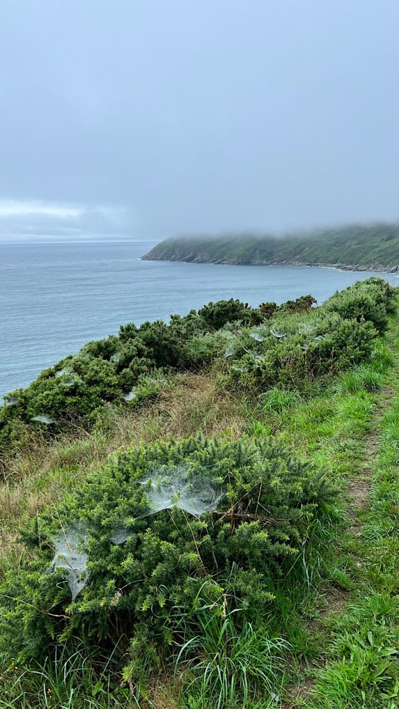 An der Steilküste gibt es ein Schild: Island- und Dartmoorponys werden hier eingesetzt um invasive Pflanzenarten in Schach zu halten. Die trampeln sie einfach platt. Und da stehen sie im Nebel, reglos, Köpfe zusammengesteckt und warten wie wir auf Sonne, die ihnen den Rücken wärmt.