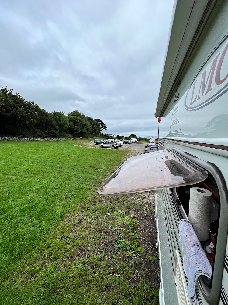 Am Parkplatz ist niemand zu sehen. Ich inspiziere alles und denke, dass er für die nächste Nacht taugt. Groß, relativ gerade und alles Rasen… passt. Den Meerblick verbaut leider eine Heckenmauer, wie die hier so üblich sind, aber das ist einen Versuch wert.