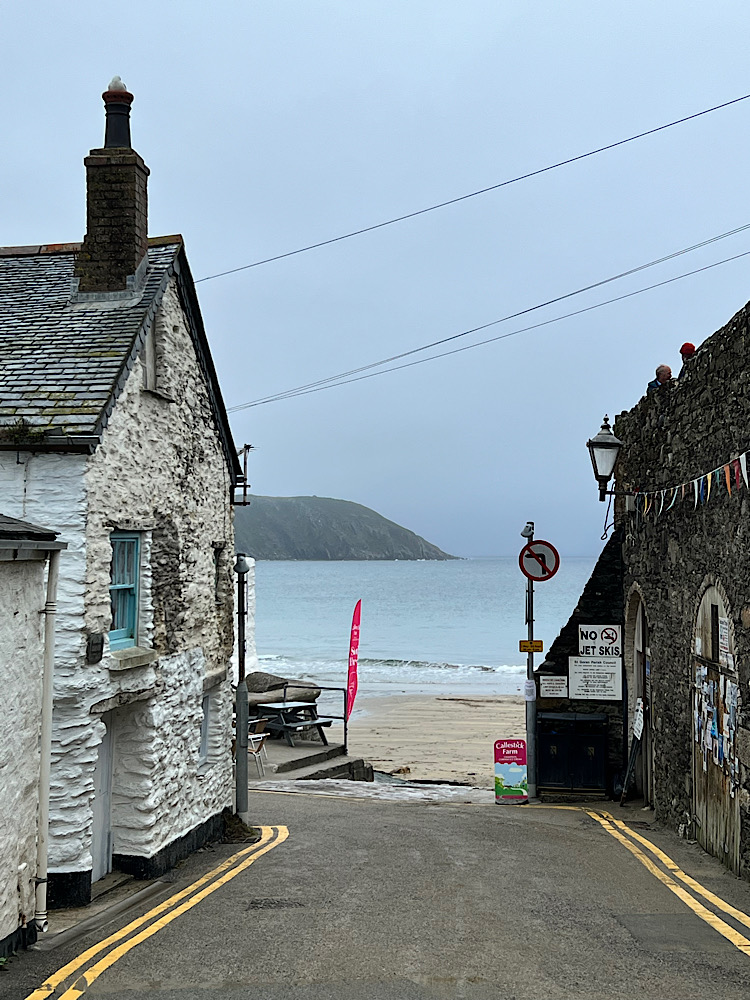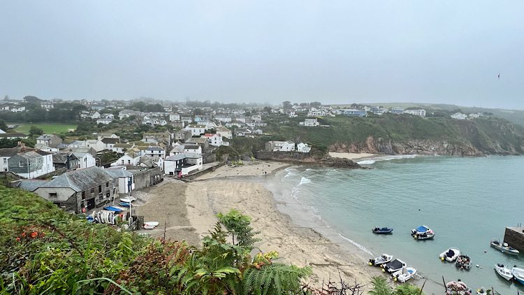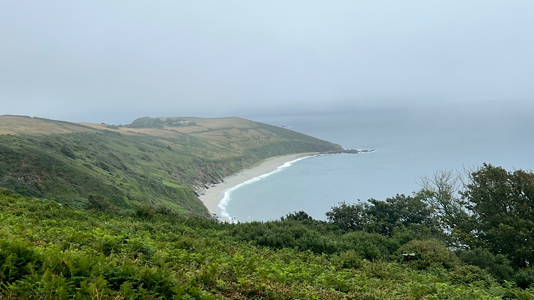 Rechts neben dem Hafen beginnt ein kleiner Wanderweg der am Bow or Vault Beach entlang zum Dodman Point führt. Es ist immer noch diesig und sicher sieht das mit Sonne alles besser aus, aber wir beide sinds zufrieden.