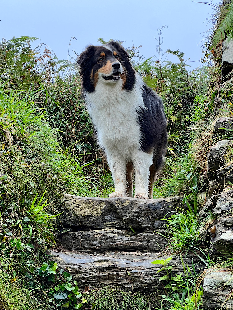 Luna flitzt immer vorneweg und bleibt plötzlich stehen. Da liegt ne Gurke, mitten auf dem Weg. Neu, eingeschweißt – sicher vom Lädchen unten im Dorf. Wer nimmt denn zum Wandern eine komplette Gurke mit? Ungefähr einen Kilometer weiter gibt es einen weiteren Parkplatz. Den möchte ich mir auf der Wanderung ansehen und checken, ob der Dicke durchpasst, denn da muss man nix bezahlen und ich überlege, noch eine Nacht zu bleiben. Vielleicht, so denke ich mir, steht da schon jemand und hat nur was zum Frühstück eingekauft. Die Gurke könnte unterwegs aus der Tasche gerutscht sein… ich nehm die mal mit, vielleicht kann ich jemandem eine Freude machen. Weiter gehts die Klippen hinauf mit Ausblicken, die sonnigentags sicher toll sind, aber auch jetzt schon Spaß machen.