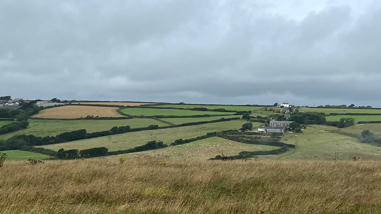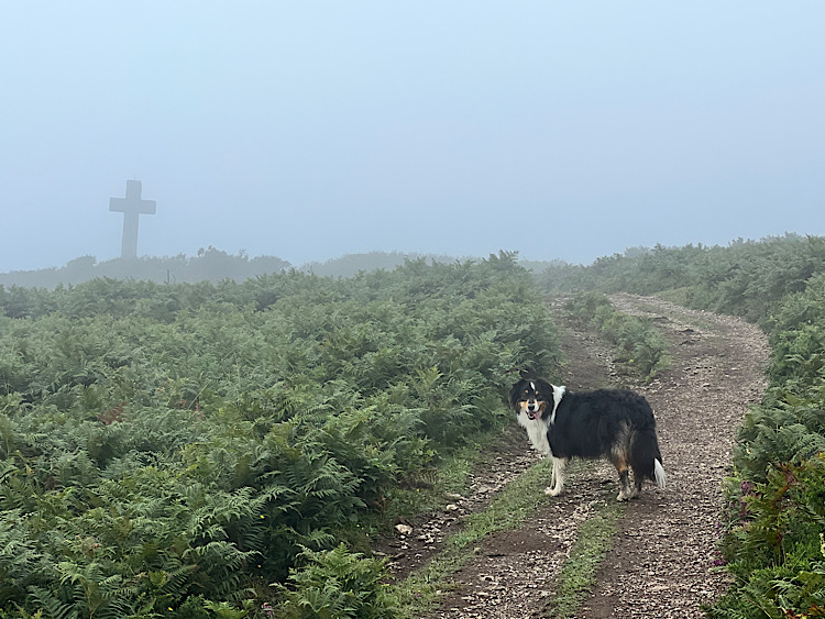 Wir laufen ganz langsam um sie herum und kommen zum Dodman Point. Hier steht ein riesige Steinkreuz, dass schon mit Moos besetzt ist.