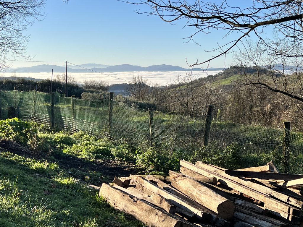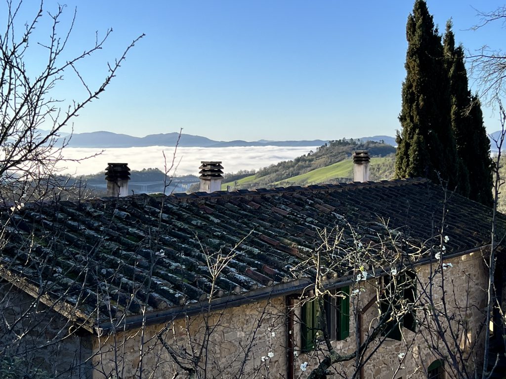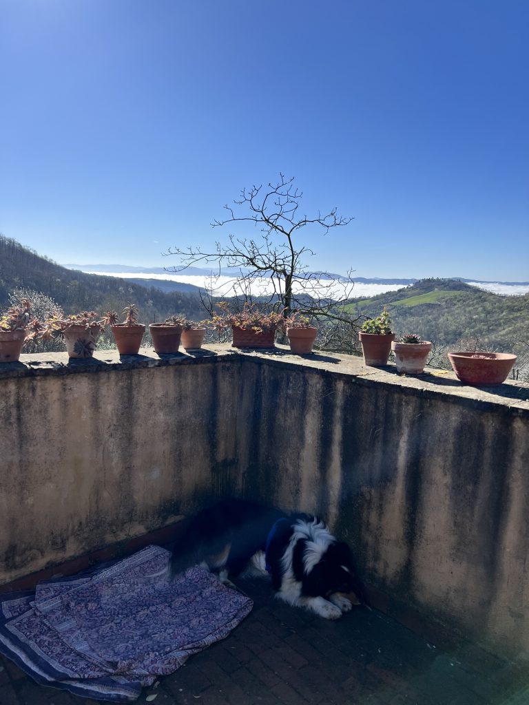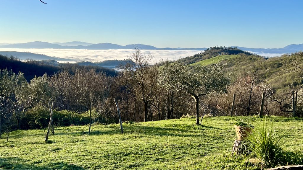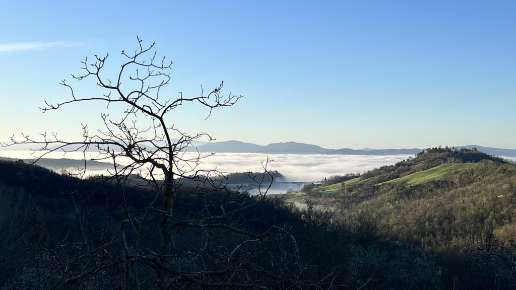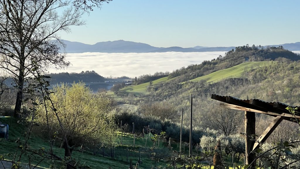 Der morgendliche Terrassenblick wird immer besser. Heute liegt eine dicke weiße Wolkenschicht wie ein kuschelig weiches Federbett über Barbarino di Muggelo und dem großen Teich. Angelo freut sich, denn wir hier oben haben Sonne, die unten im Tal nicht.