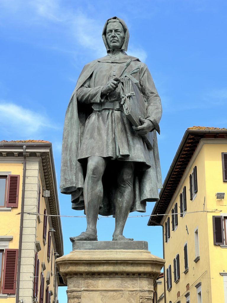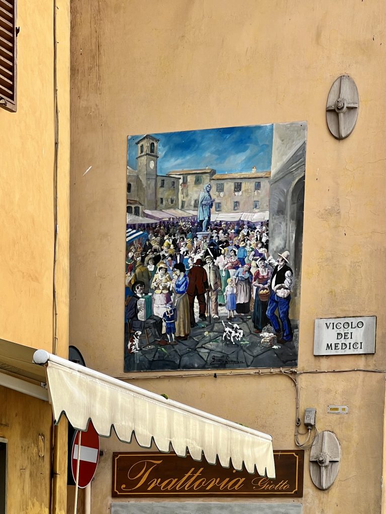 Auf dem Markplatz guckt der berühmte Sohn der Stadt – Giotto himself – mit dem Klemmbrett unter dem Arm, den Pinseln in der Hand gestreng auf die Ereignisse der Gegenwart und scheint nicht begeistert zu sein. Drüben, neben dem Gemüseladen kann man sehen, was hier so an Markttagen los sein kann, also nicht so totenstill wie heute wird das dann hoffentlich sein, vielleicht hat dann auch der olle Giotto mehr Spaß.
