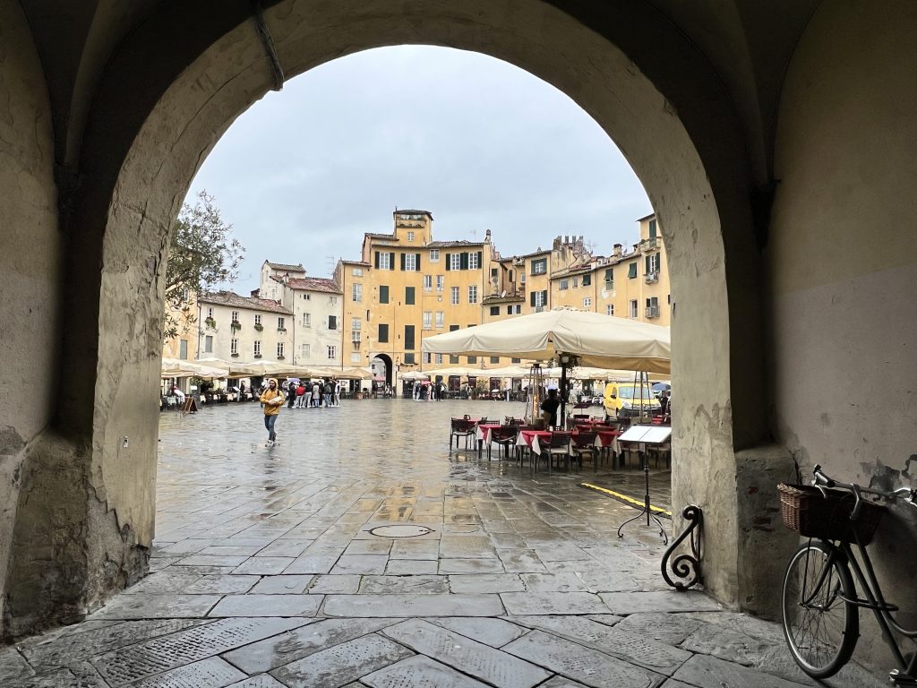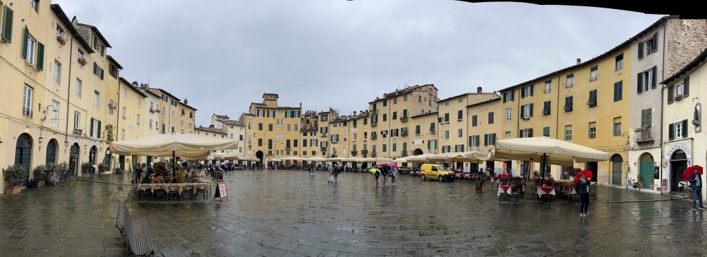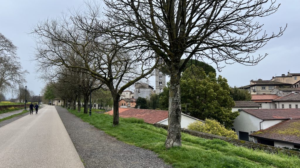 Lucca ist ein hübscher Ort, der als Handels- und Verwaltungsstadt keinen hässlichen Industriegürtel hat. Schutz bietet immer noch eine dicke alte Mauer, die wir an der Porta Santa Maria durchschreiten. Oben auf dem Wall kann man einen 4km langen Spaziergang machen, wir begnügen uns mit 200m und biegen dann ab in Richtung Piazza Anfiteatro.