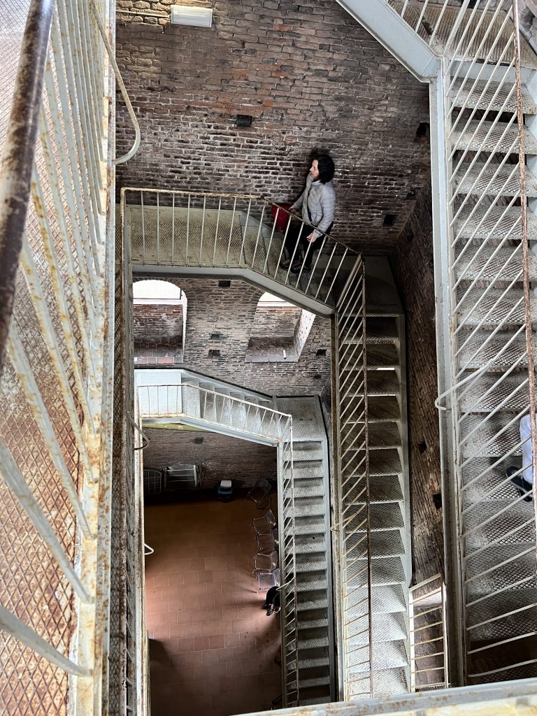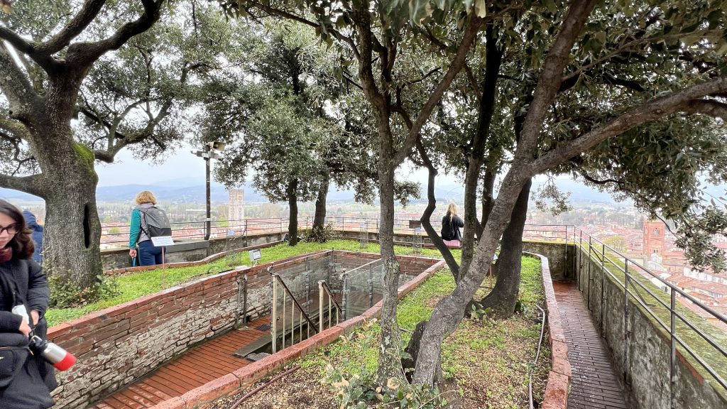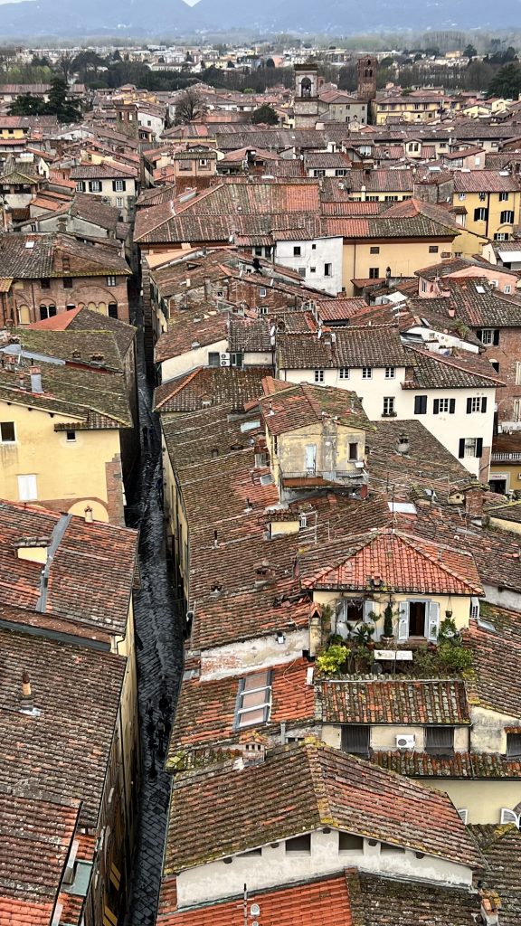 Weiter gehts zum Torre Guinigi, einem 44m hohen Backsteinturm der als Wahrzeichen der Stadt gilt und einen fantastischen Blick über die Dächer bietet. Das Besondere: auf seiner Spitze wachsen jahrhundertealte Steineichen. Das möchte ich gern sehen und die Dame am Eingang erlaubt sogar, dass Luna mit hinauf darf. Die Hälfte der 230 Stufen schafft sie locker, doch dann werden es eisernen Stufe durch die man in die Tiefe blicken kann und das ist ihr nicht geheuer.