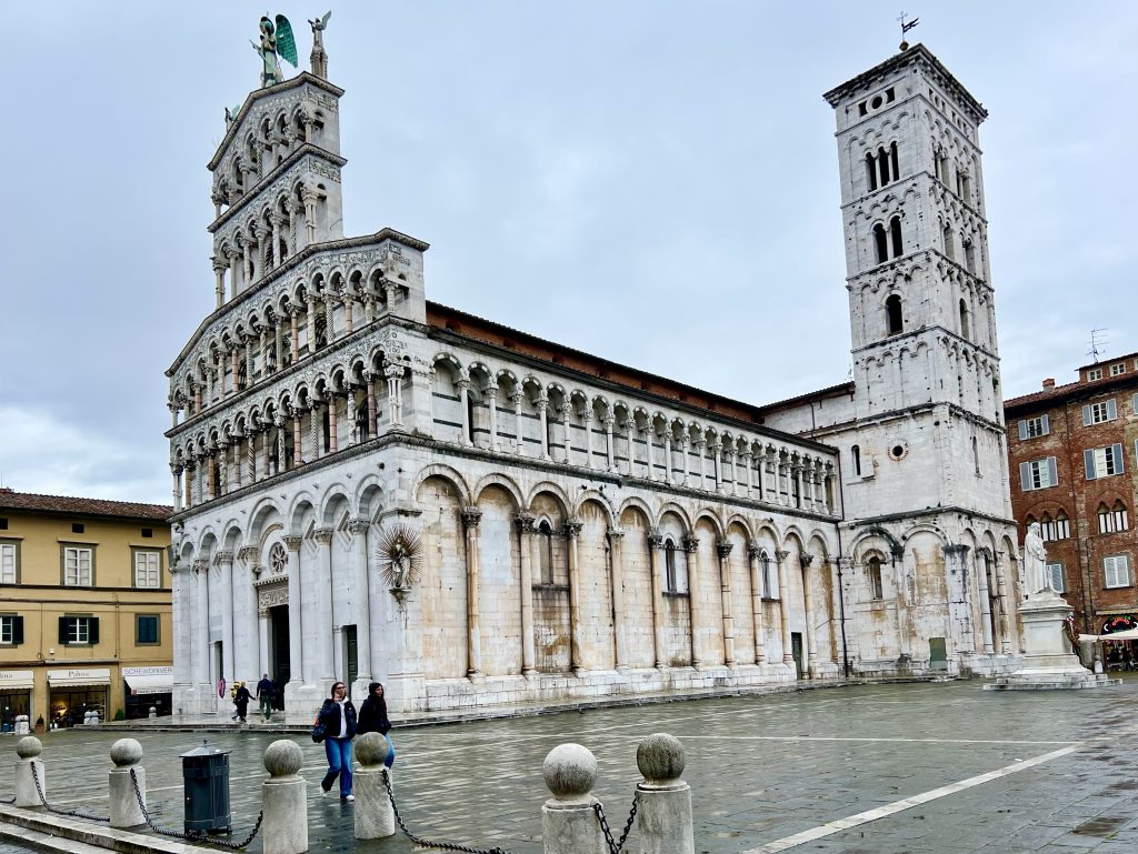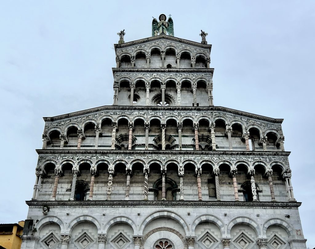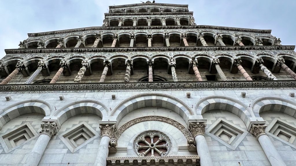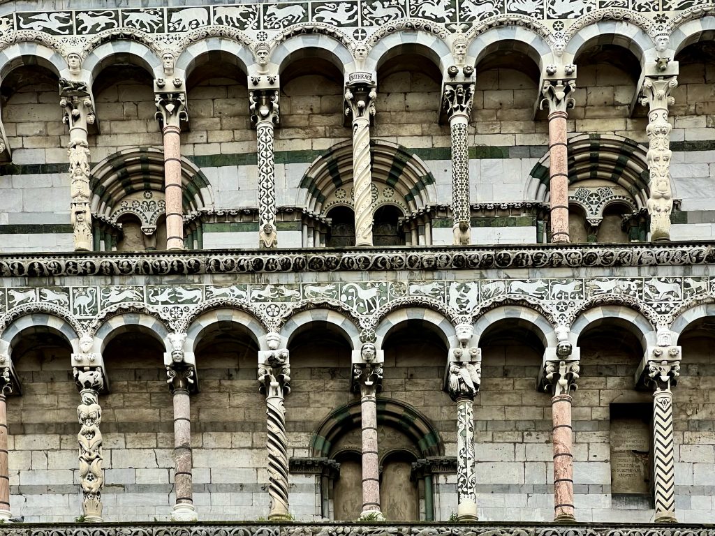 Lucca wird auch der „kleine Vatikan der Toskana“ genannt, weil hier exakt 99 Kirchen und Kapellen zu bestaunen sind. Die erste, die mich vor allem mit ihrem Portal beeindruckt, ist die San Michele in Foro. Auch hier baute man vom 11. bis 14. Jahrhundert auf altrömischen Resten: in Foro bedeutet im Forum. An gleicher Stelle erstreckte sich früher also das römische Forum. Die Kirche heute – ein Glanzstück der Steinmetzkunst. Verschiedene Farben, Formen, Muster, Motive, Symbole und Tiere sind hier zu bestaunen und man wünscht sich eine Hebebühne, um alles noch genauer betrachten zu können. Fast unglaublich ist die Geschichte, dass im 19.Jahrhundert die Köpfe oberhalb der Kapitelle durch damals bedeutende Persönlichkeiten ersetzt wurden. Man stelle sich nur vor, am Berliner Dom würden morgen die Sandsteinköpfe von Scholz, Lindner und Habeck prangen… Damals hat man das gemacht und so sieht man irgendwo da oben die Konterfeis Napoleon des III., Garibaldis und Cavours, letzterer ein italienischer Staatsmann.