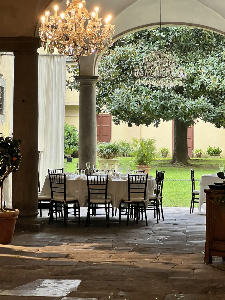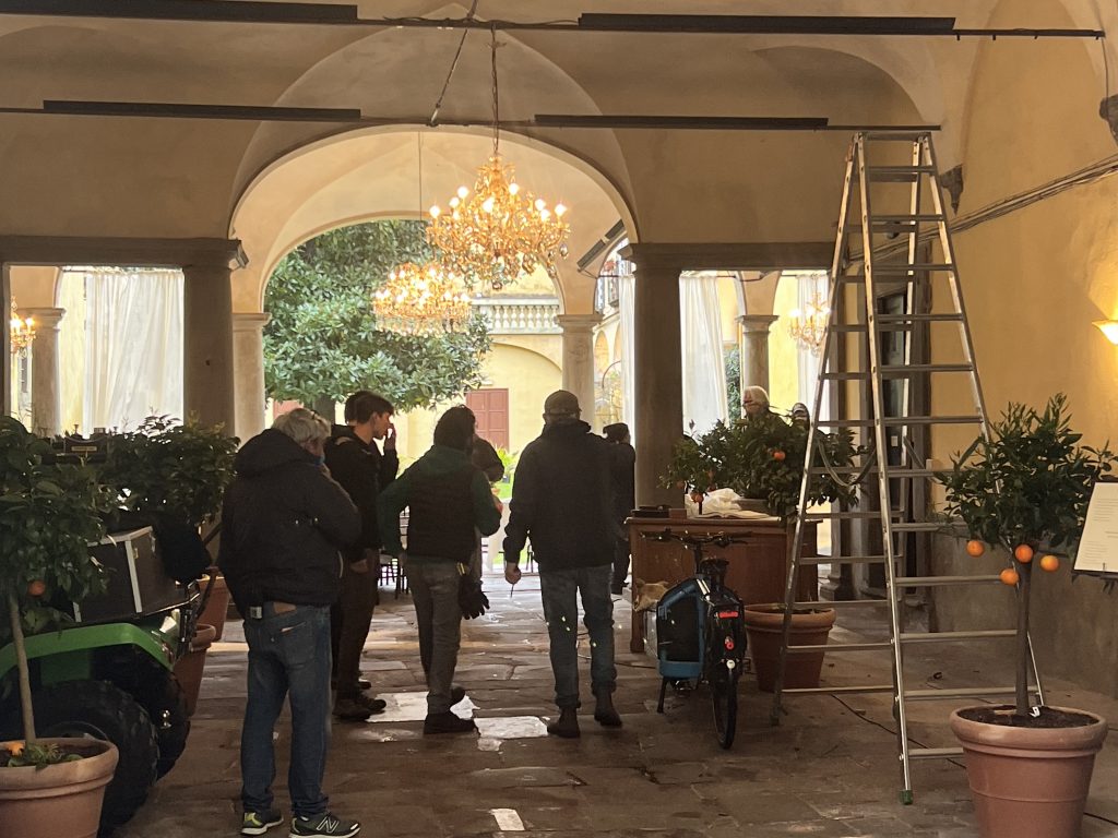 Unterwegs dann viele Miet-Transporter, eine Tonwagen, wuselnde Techniker – und ein schön geschmücktes … na bestimmt! Ist das nicht ein Filmset? Kronleuchter und weiß gedeckte Tische. Hier dreht bestimmt bald der Herr Hofmann. Ein Blick ins Netz verrät: Es entsteht ein neuer Film mit dem britischen Regisseur Peter Greenaway, ein Film in Luccas historischem Ambiente. Die Handlung erzählt die Geschichte eines New Yorker Schriftstellers, der sich ein Sabbatical gönnt und Lucca besucht, um seine italienischen Wurzeln zu erkunden. Als Hintergrund die Welt von 2001 mit dem Anschlag auf die Twin Towers. Okay, na da bin ich aber sehr neugierig drauf. Vielleicht erkennt man ja dann auch dieses Set.
