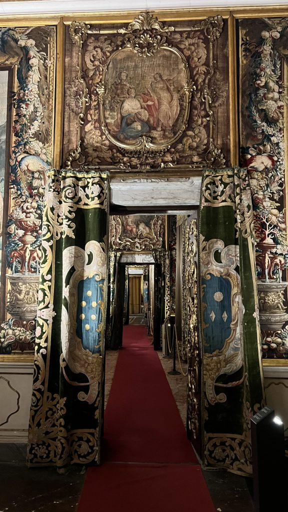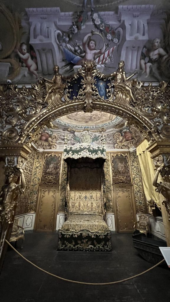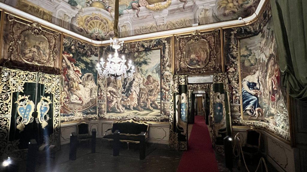 Nun aber los in den Palazzo und seine prunkvollen Gemächer des 17.Jahrhunderts. Dass die Familie Mansi eine reiche Tuchhändler-Dynastie war, lässt sich an den vielen, mit wertvollen Stoffen ausgekleideten Räumen unschwer erkennen, auch die Schlafgemächer sind über und über mit kostbaren Designs bedeckt.
