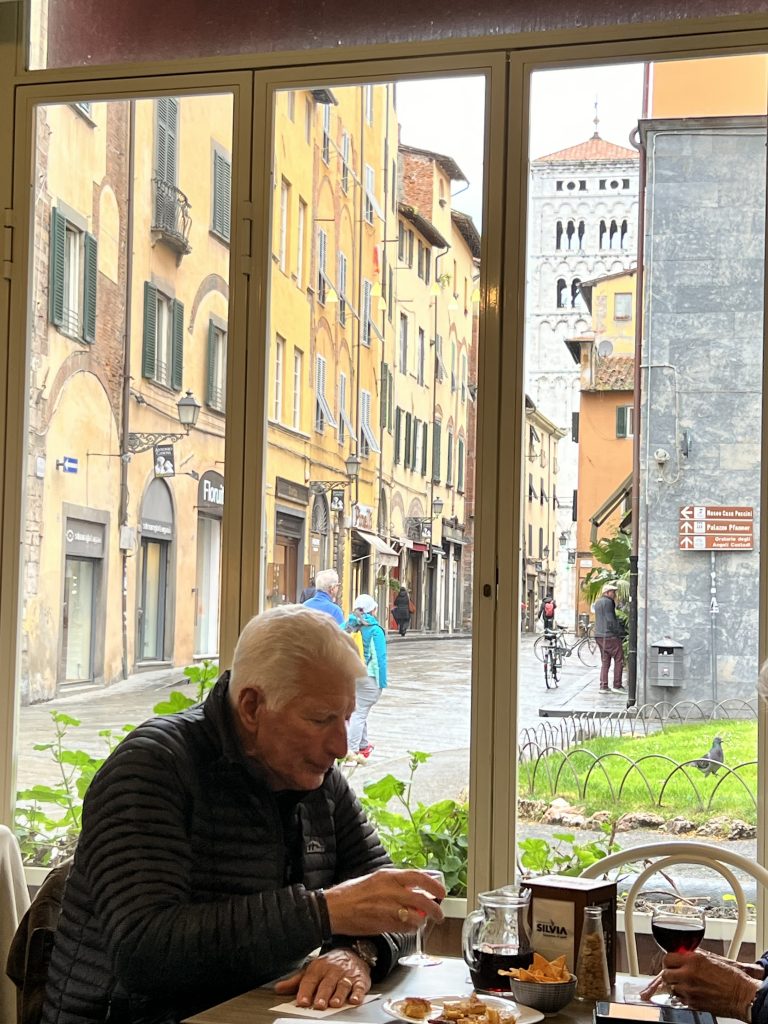 Lucca solls sein – 1h 20min zu fahren. Toto verabschiedet uns am Auto und los gehts. Auf halber Strecke den Berg hinunter kommt uns Angelo entgegen, sicher hat er in Barbarino das Nötigste eingekauft. Ich warte am schmalen Straßenrand, lasse den Gegenverkehr vorbei und als der genau neben mir zum Stehen kommt, erkenne ich ihn hinterm Steuer. Er senkt die Scheibe und fragt, was wir heute machen wollen. „Lucca?? Na vielleicht trefft ihr da ja Dustin Hofmann, der dreht da gerade einen Film, viel Spaß!“, und schon zuckelt er den Berg wieder hinauf. Dustin Hofmann – in Lucca – na klar…