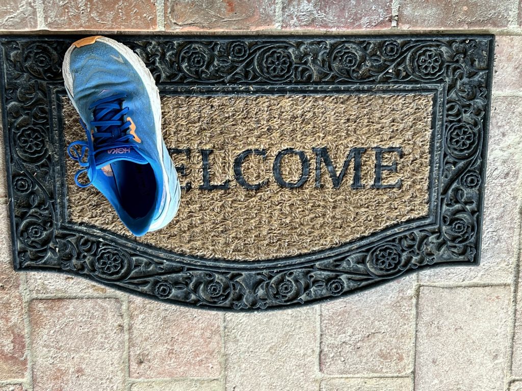 Die erste Nacht in unserem neuen Quartier war fantastisch. Ruhig, bequem und auch Lunchen fühlt sich sehr wohl. Ich mach die Tür auf und genieße die Morgenluft. Ein Blick nach unten lässt mich stutzen: Ein Schuh? Wo ist der andere. ich hatte gestern meine nassen Turnschuh zum Trocknen vor der Tür gelassen. Das war augenscheinlich ein Fehler. Auf zur Gassi-Such-Runde. Nichts! Nirgends ein blaues Leuchten. Der Schuh ist weg. Ich beschließe nach dem Frühstück, den übrigen sichtbar hinzustellen. Vielleicht kann der Finder ja dann schlussfolgern.