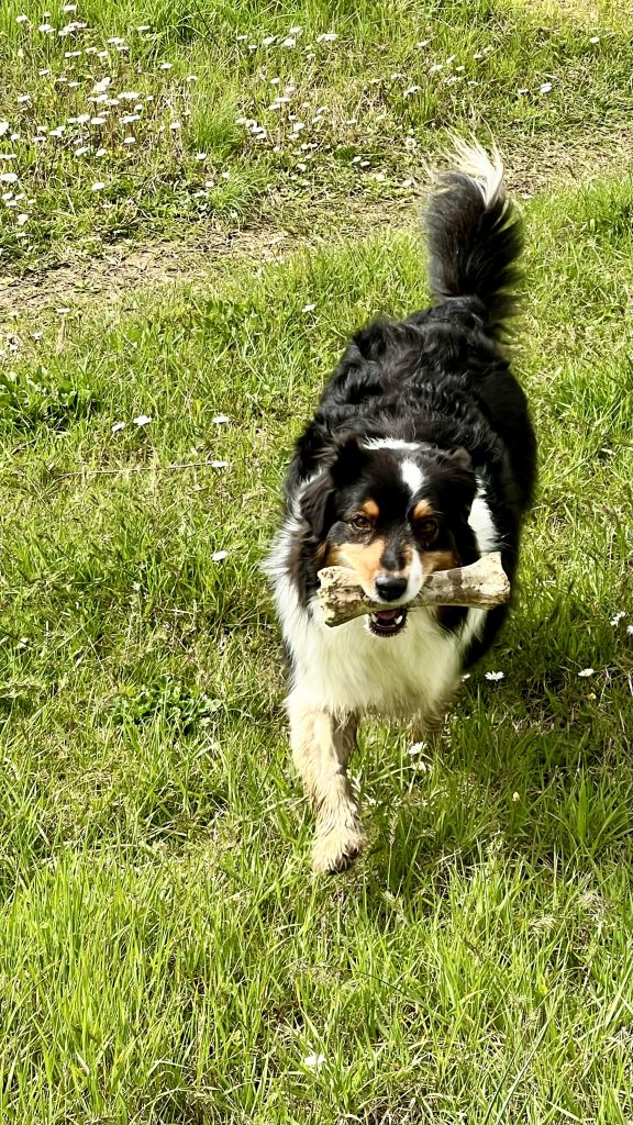 Der Weg führt durch die Weinberge und als wir etwas abseits des Weges über eine Wiese laufen wollen, stürmen aus dem gegenüberliegenden Bauernhof neu riesige weiße Hütehunde auf uns zu. Da tritt selbst meine tapfere Luna den Rückzug an. Unten in der Senke am Bächlein halten sie inne und so bleiben wir von einer Umzingelung verschont.