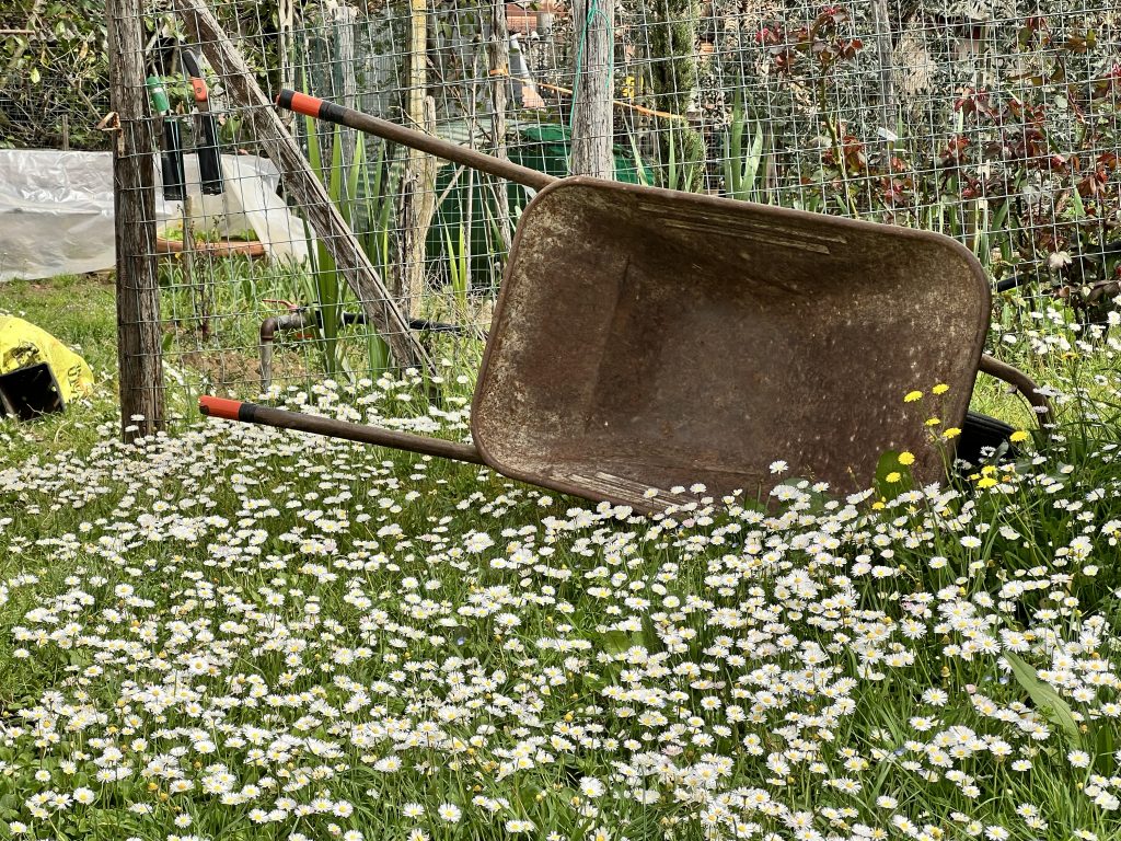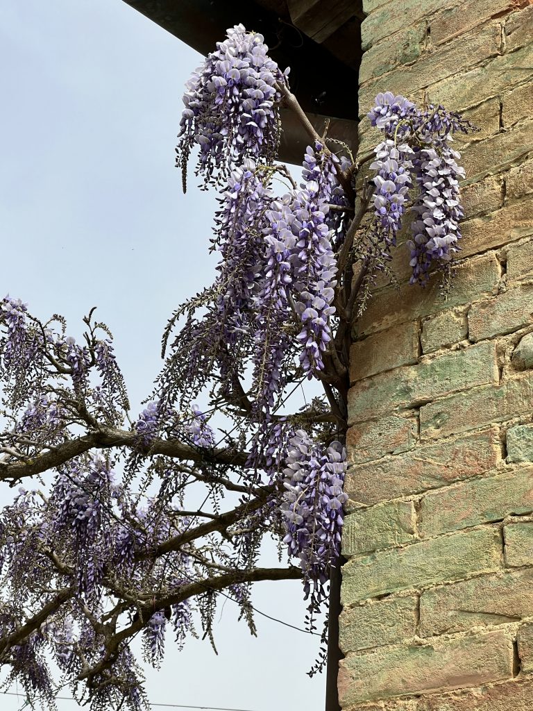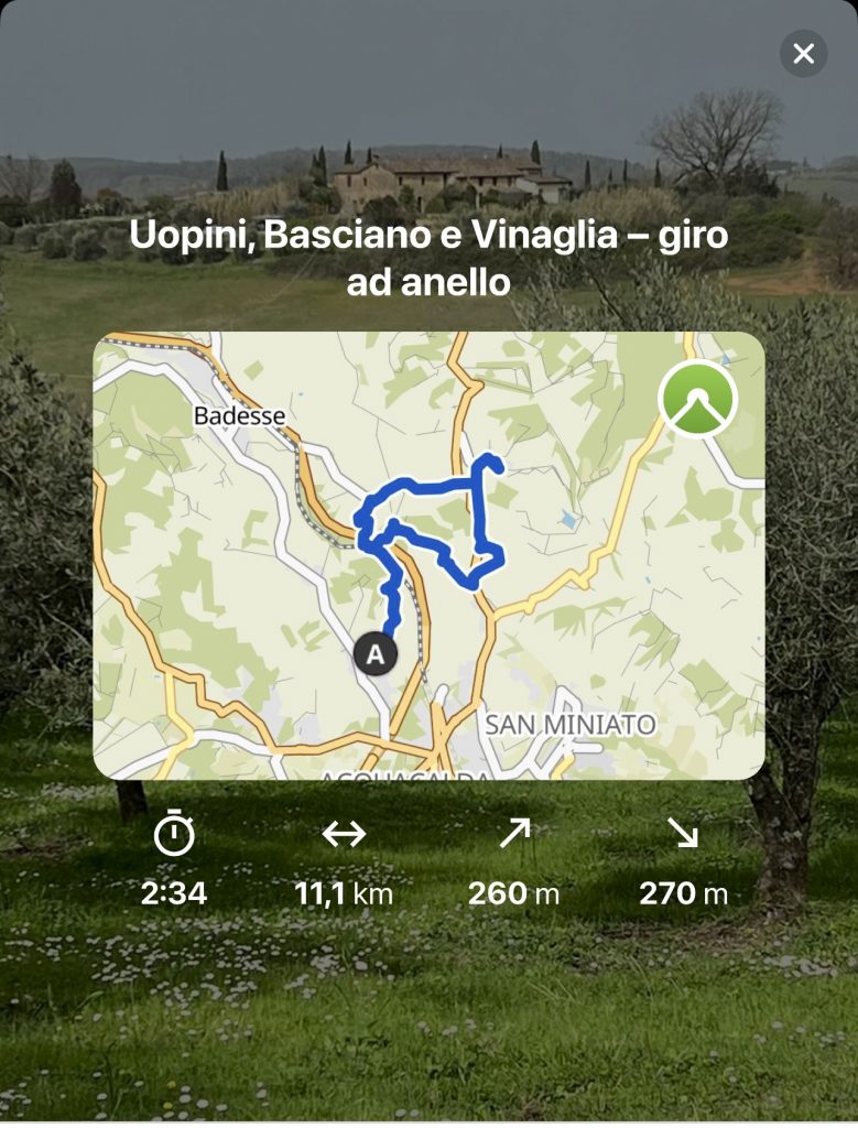 Wandern möchte ich heute und das Wetter passt. Komoot schlägt mir eine Runde ganz in der Nähe vor und die Wanderschuhe habe ich ja noch. Wir parken den Caddy in Uopini und starten immer bergab. Ringsum sprießt alles vor sich hin: Veilchen, Schlüsselblumen, riesige Mariendisteln, Sternannemonen, Neapoletanischer Lauch, Günsel, Nieswurz, Hahnenfuß und riesiger Schachtelhalm… mein Pflanzenapp-App hat ne ganze Menge zu tun. Aber auch Blauregen und Tulpen blühen miteinander um die Wette.