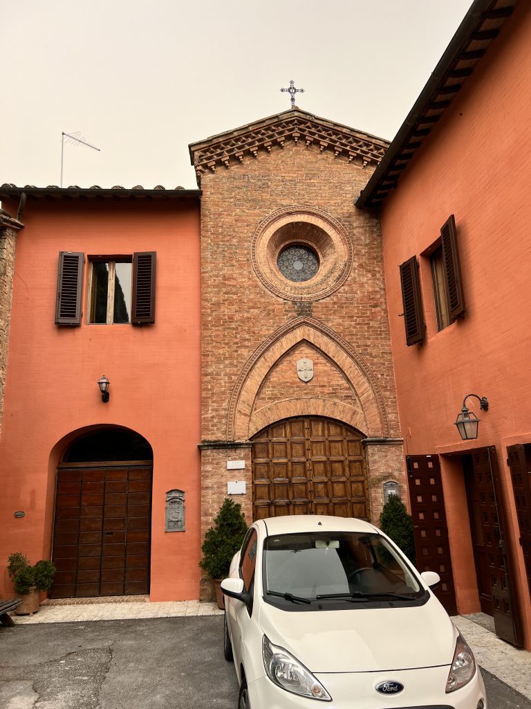 Pause machen wir in Poggiarello auf einer Wiese und auch hier scheint alles wie ausgestorben. Oben auf dem Hügel liegt eine wunderschöne alte Villa – heute ein Lost Place, in dessen Innenhof nur noch ein altes Polizeiauto seine letzte Ruhe gefunden hat. Nicht weit davon in Basciano, einem Dörfchen, das auf einer zerstörten Burg errichtet wurde, die „kleinste Kirche der Welt“… würde ich vermuten…