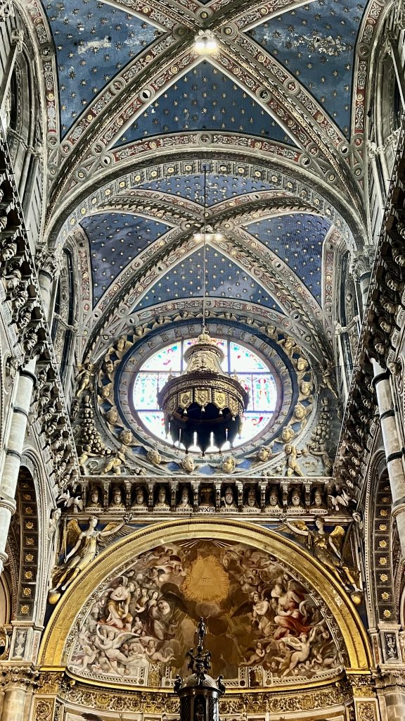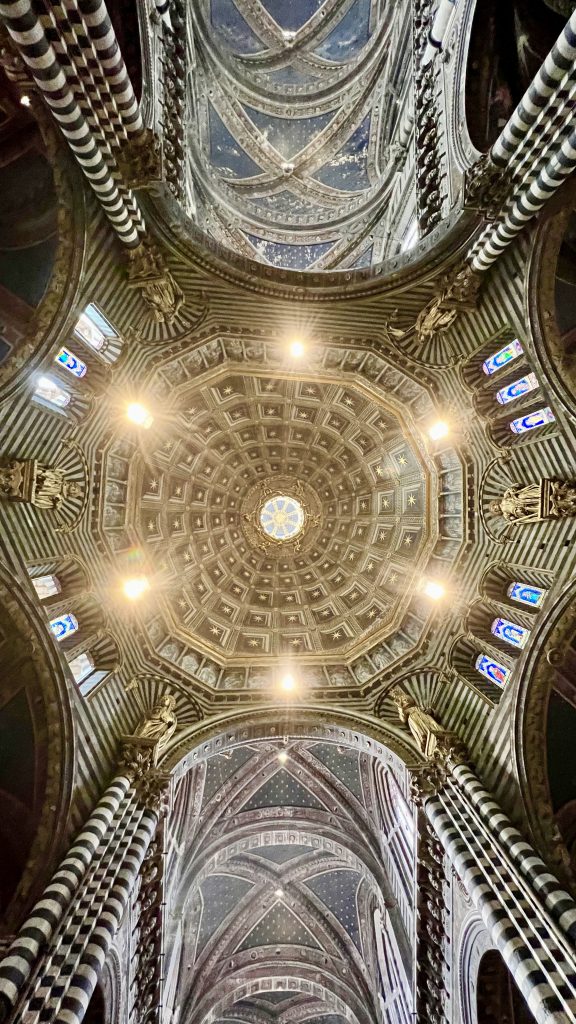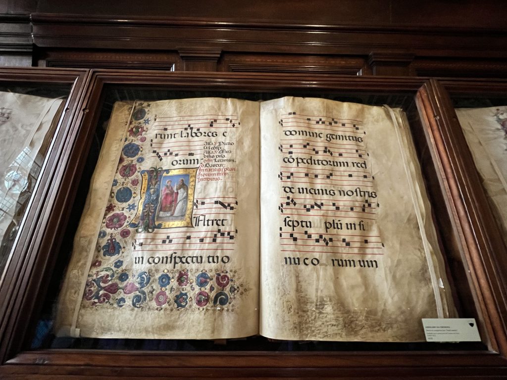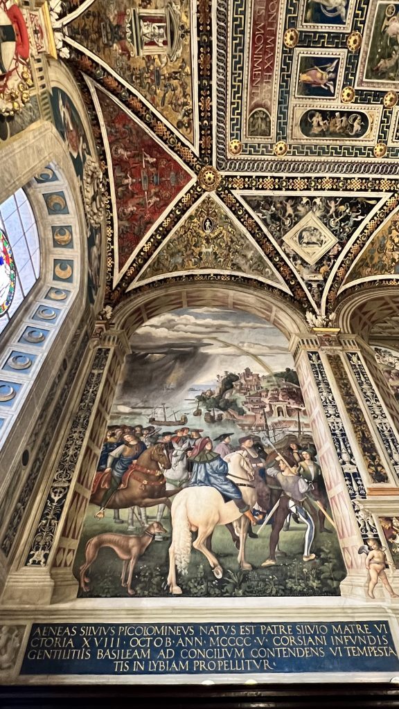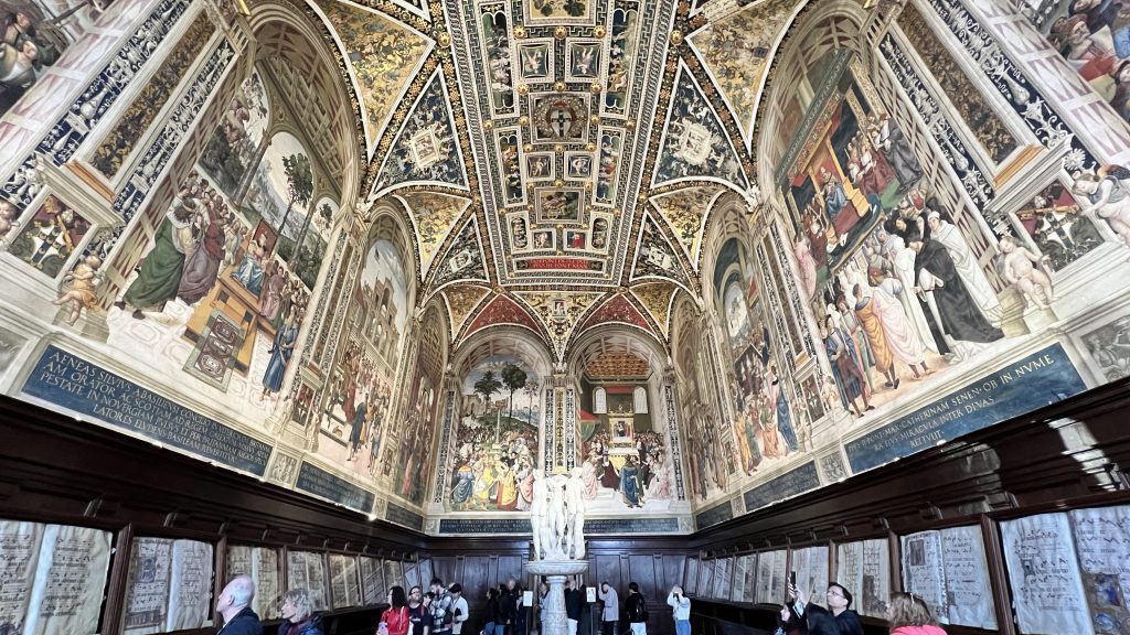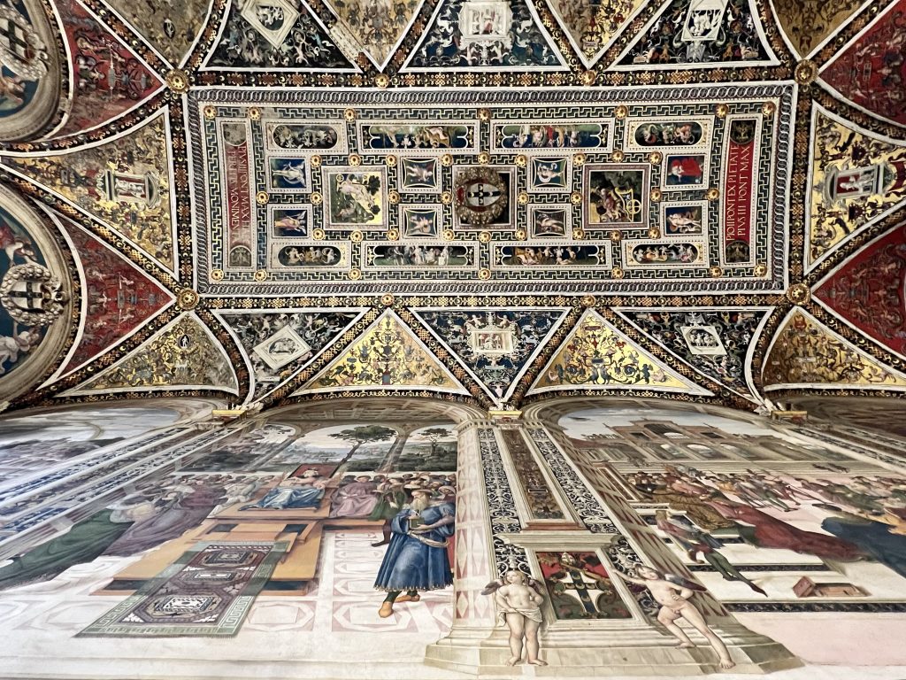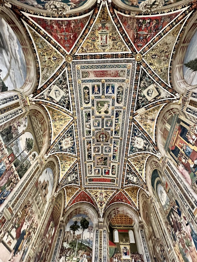 Ein weiteres Highlight ist die Piccolomini-Bibliothek. Als Francesco Todeschini Piccolomini noch Kardinal war, später wurde er Papst Pius der III. , spendierte er dem Dom diese Kostbarkeit, ließ deshalb aber auch alle wunderbaren Fresken rundherum nur einem Thema widmen: seinem Leben. Unfassbar aufwendig auch die Deckengestaltung und in den Vitrinen lagern wunderschöne Notenbücher.