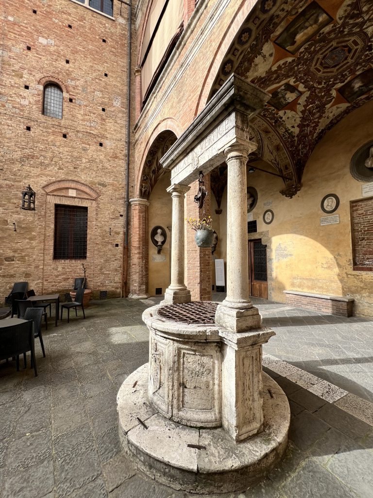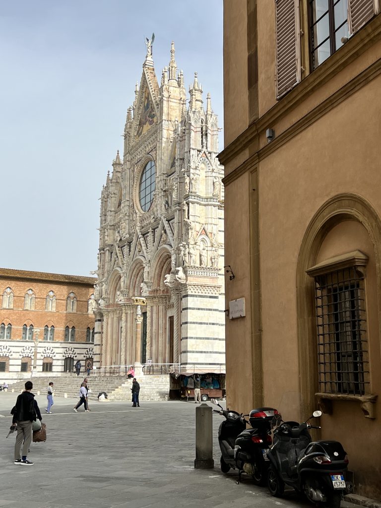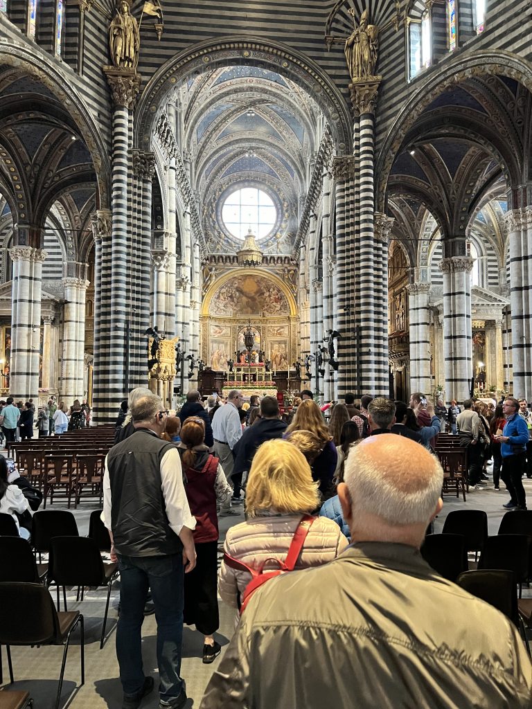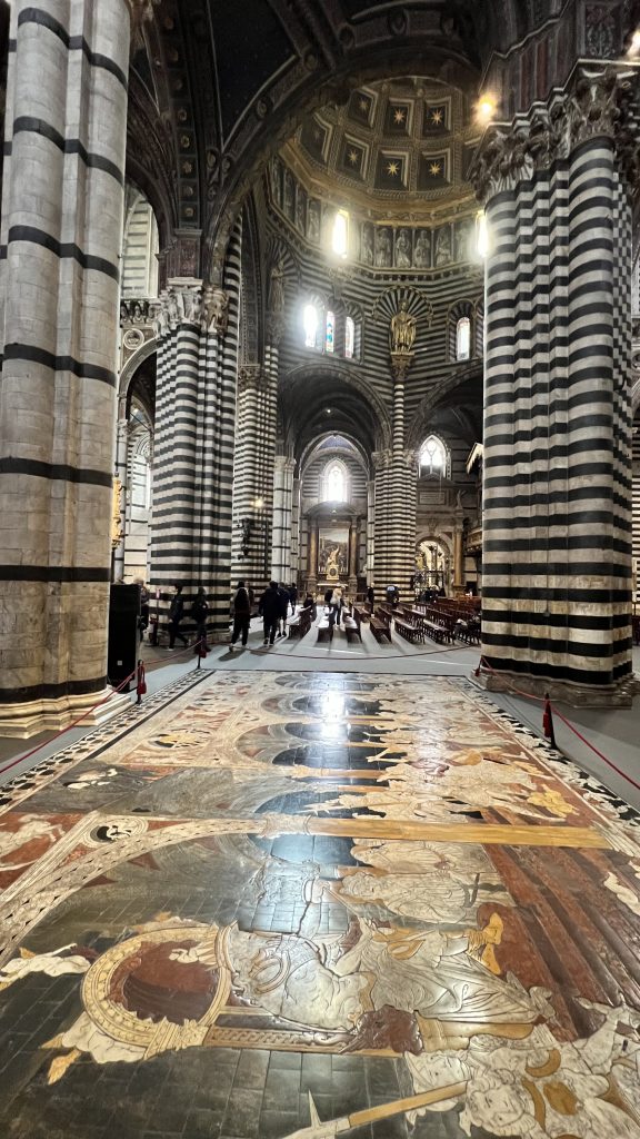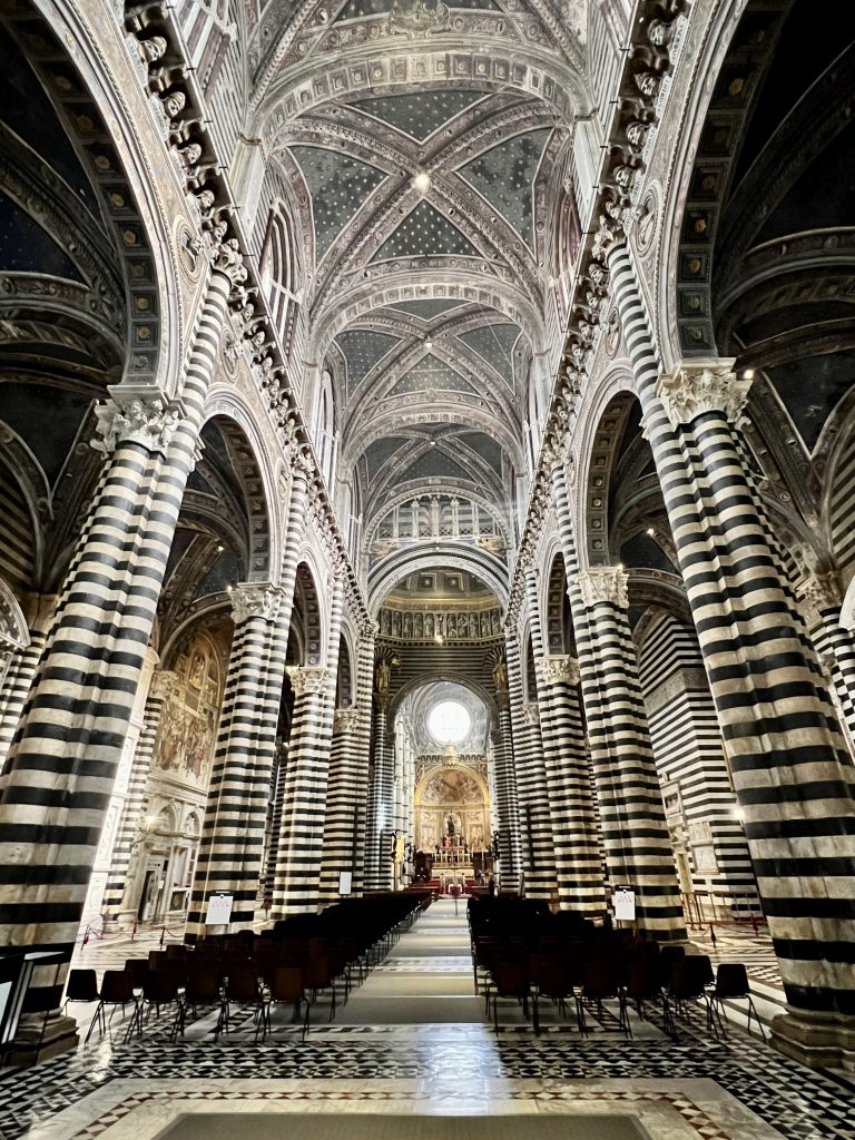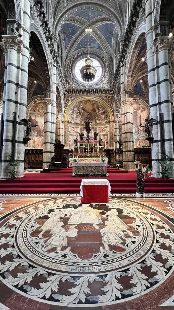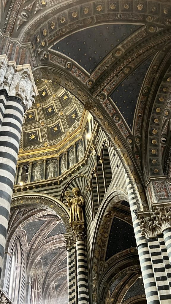 Ein weiteres Highlight ist die Piccolomini-Bibliothek. Als Francesco Todeschini Piccolomini noch Kardinal war, später wurde er Papst Pius der III. , spendierte er dem Dom diese Kostbarkeit, ließ deshalb aber auch alle wunderbaren Fresken rundherum nur einem Thema widmen: seinem Leben. Unfassbar aufwendig auch die Deckengestaltung und in den Vitrinen lagern wunderschöne Notenbücher.