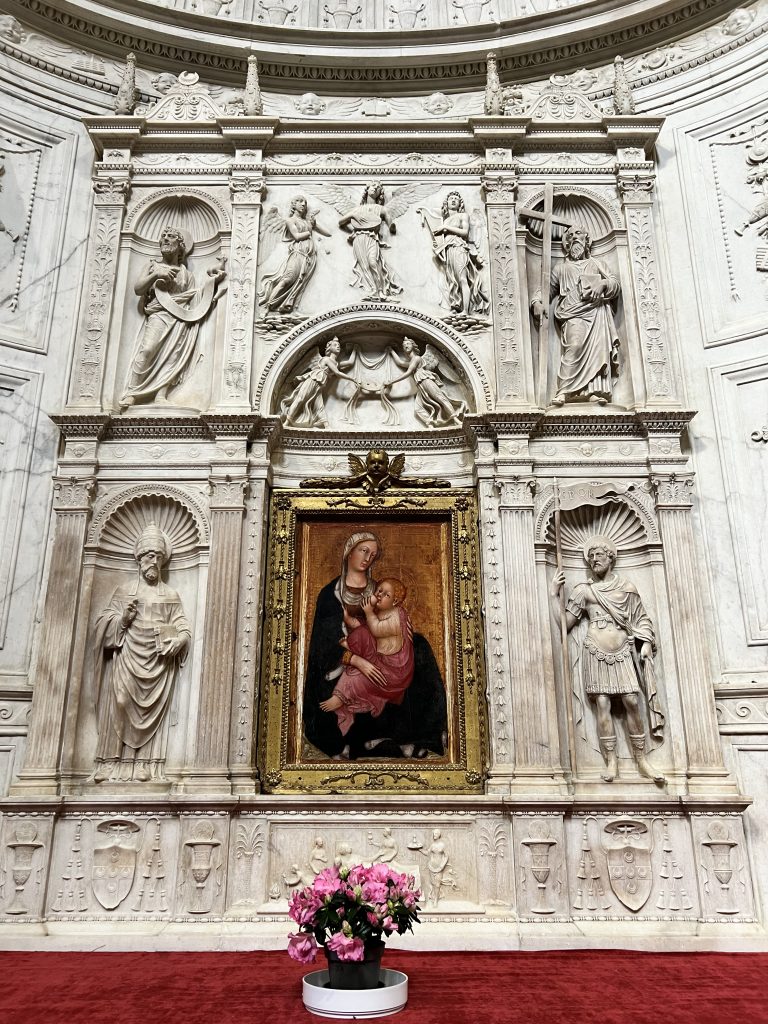 Gleich daneben der Piccolomini-Altar, für den Michelangelo den Auftrag erhielt, 15 Statuen anzufertigen. Das war ein lohnendes Geschäft und er bekam stattliche 500 Golddukaten als Anzahlung. Nur 5 Statuen hat er allerdings geliefert, denn Serienproduktion war augenscheinlich nicht sein Ding. Noch seine Nachfahren mussten an die Piccolomini-Familie Geld zurückerstatten, als nach seinem Tod eine Lieferung dann völlig unwahrscheinlich wurde.