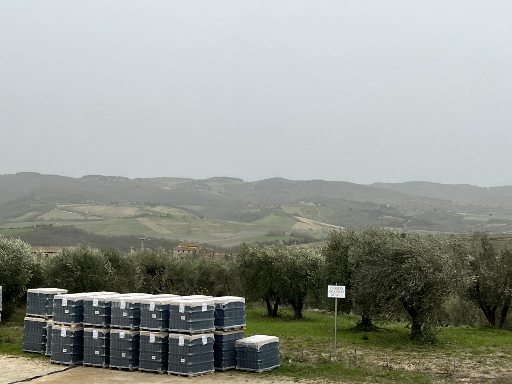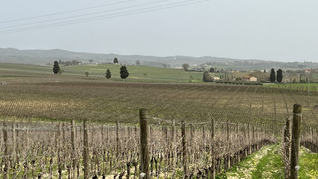 Zuhause angekommen freut sich meine Luna natürlich sehr und gleich schnappen wir uns die Leine für einen langen Spaziergang durch die Weinberge. Hier sind alle fleißig am Rückschnitt der Stöcke und oben auf dem Berg, an der Villa Trasqua, sind die neuen Flaschen für die Ernte im Herbst schon geliefert, ob Olivenöl oder Wein reinkommt – wer weiß das schon?