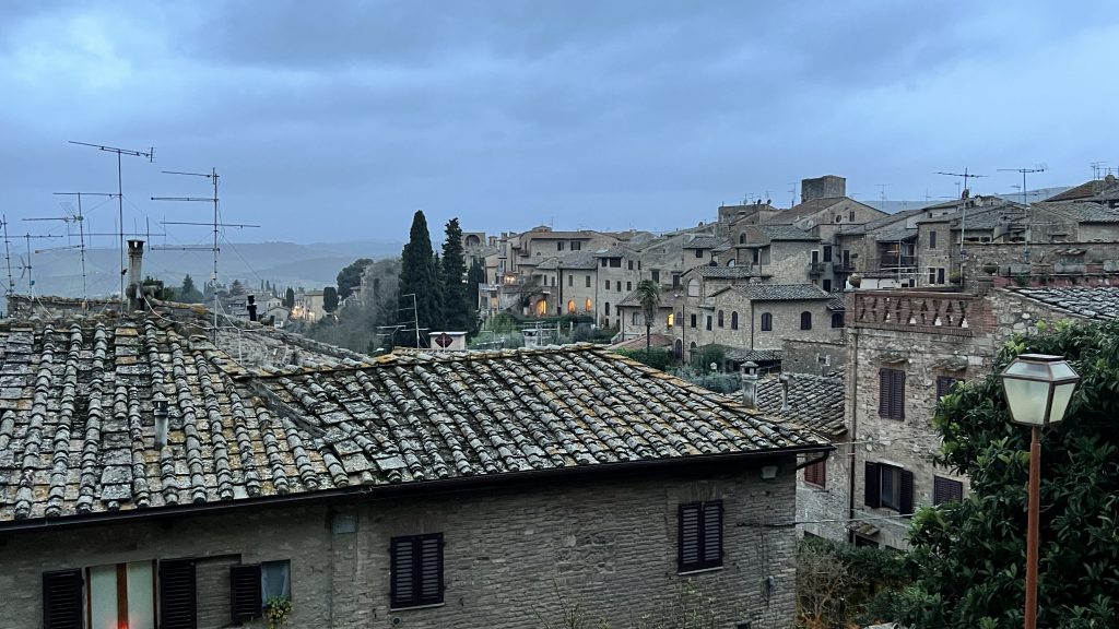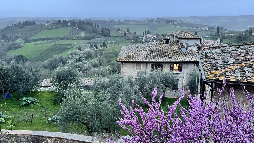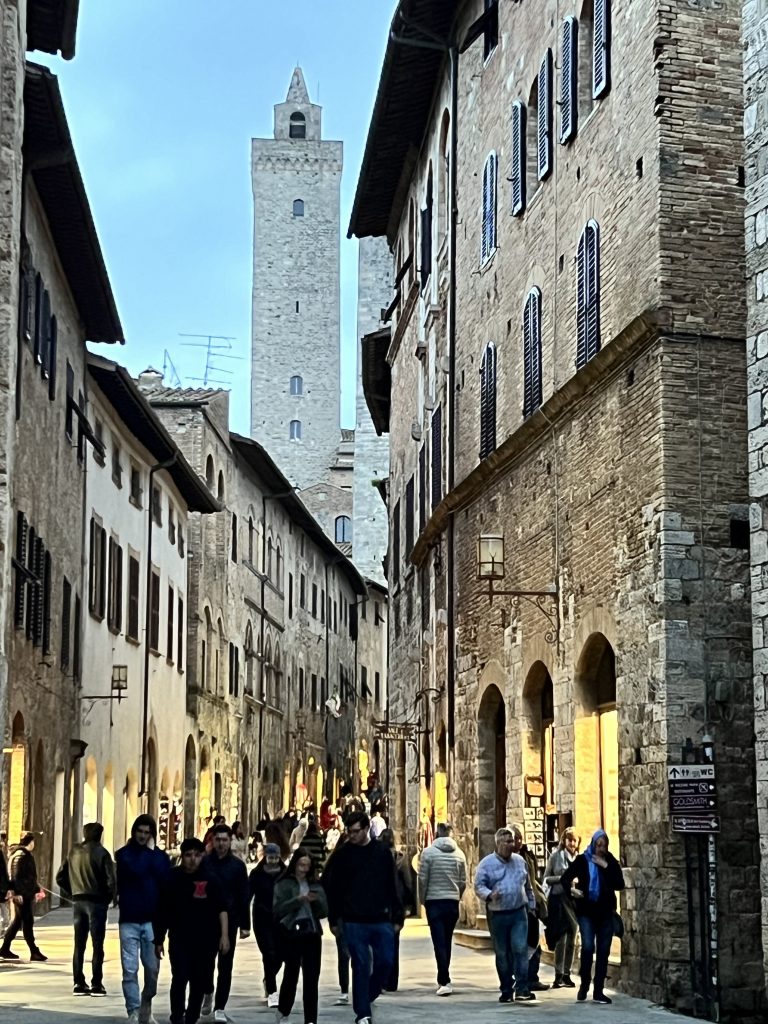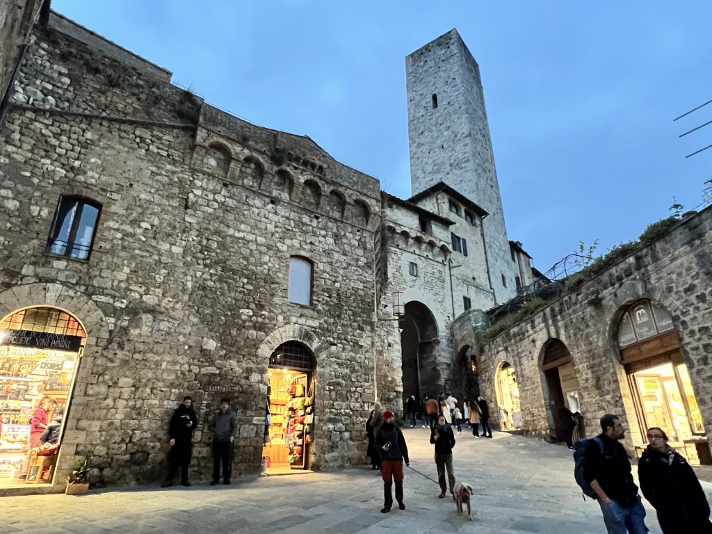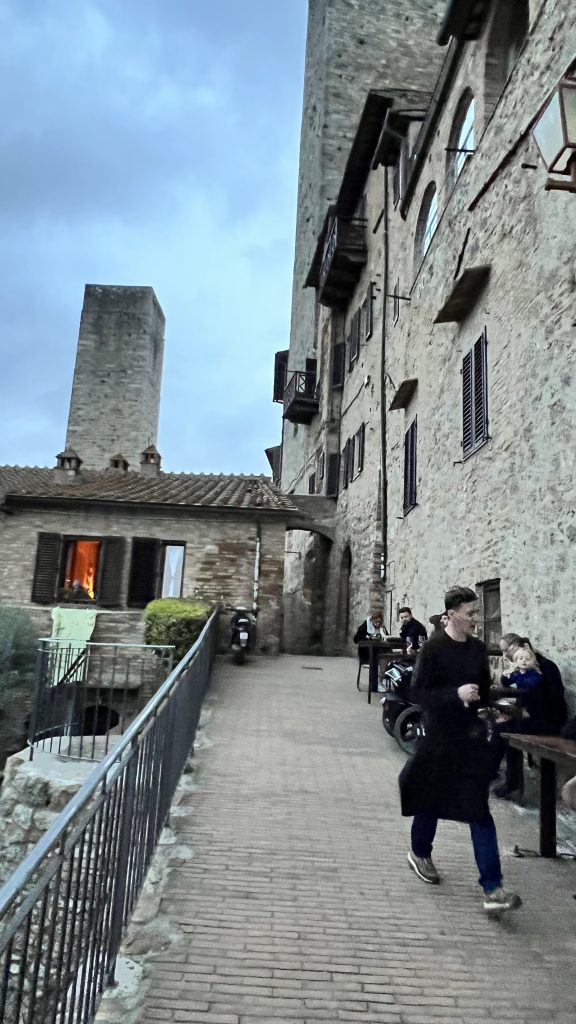 Es ist 16:00 Uhr, als wir wieder zurück sind und nach einem kurzen Nachmittagsschläfchen, raffen wir uns noch einmal auf. San Gimigniano ist ca. 25km entfernt und sieht auch am Abend sicher ganz wunderbar aus. Die kleine Stadt ist durch ihre sogenannten Geschlechtertürme bekannt geworden. Sicher gibt es dort auch ein Abendbrot mit WLAN und so kommen wir an, als sich ein Großteil der Besucher auf dem Heimweg befindet. Leer sind die Parkplätze und die Gassen trotzdem nicht, aber alle meine Wünsche gehen in Erfüllung: stimmungsvoller Bummel durch die Gassen, leckere Panini und Internet.