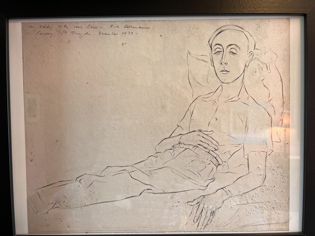 Im Turm hatte der Cousin seine Wohnung mit Blick hinab in den Innenhof, der auch schon als Filmlocation diente. Eddy war allerdings ein kränklicher Musikkritiker und den schönen Künsten als auch den Männern zugetan, was leider im Englischen Königreich der damaligen Zeit verboten war, also Letzteres. Und so unterzog er sich in Deutschland bei Dr. Martin in Freiburg allerlei fragwürdiger Behandlungen, zu denen auch Hormontherapien und seltsame Injektionen gehörten, um sich von dieser „Krankheit“ zu kurieren. Sicherlich war das seiner Gesundheit nicht gerade zuträglich gewesen, was man auf dieser Zeichnung gut erkennen kann.