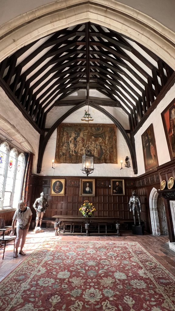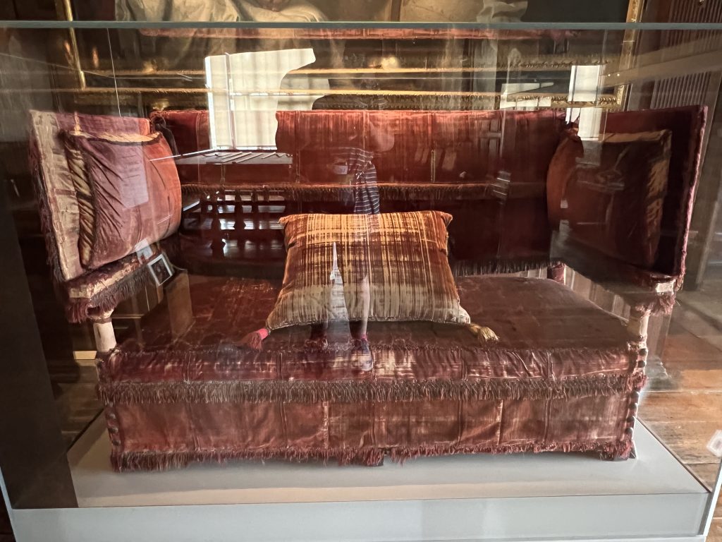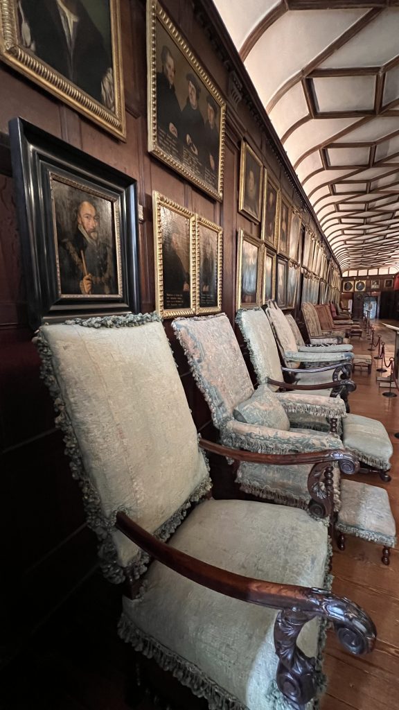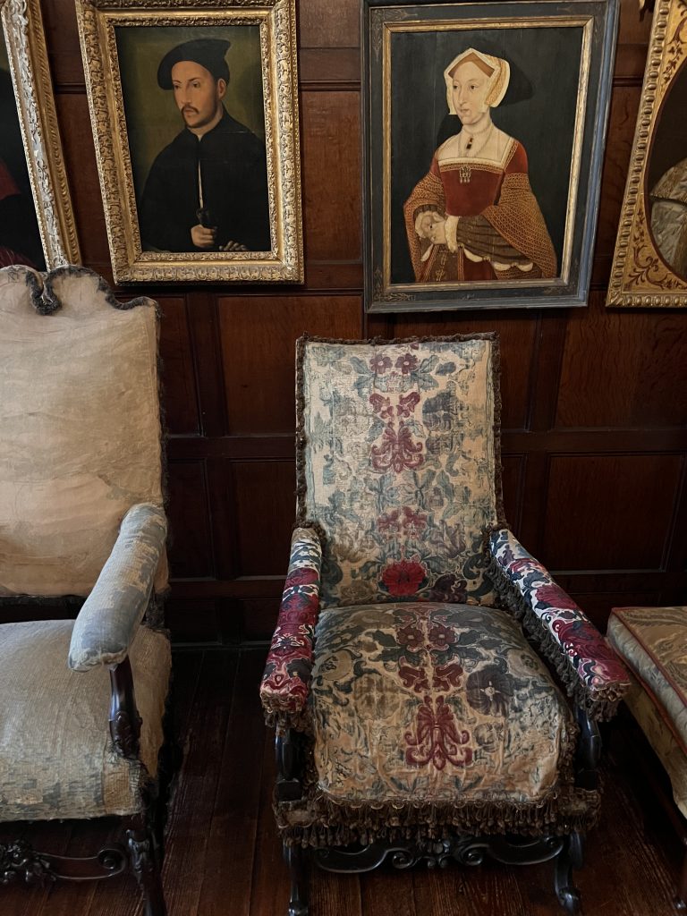 In der Galerie alle Größen der Jahrhunderte im Portrait – darunter eine einzigartige Sammlung alter Sitzmöbel. Der Sammler – ein Vorbesitzer – war Berater am königlichen Hof und durfte immer dann ein Möbelstück mitnehmen, wenn es aus der Mode war oder nicht mehr gefiel. So entstand die einmalige Sammlung von Möbelstücken der Tudor-Zeit. Ein wirklich bedeutendes Stück, über das wir sicher heute noch froh sind, ist die Mutter aller Sofas: nach ihr wurden die Sofas der Folgezeit gefertigt und noch heute kann man ein klassisches „Knole Sofa“ zum Schnäppchenpreis von 4590,- € kaufen. ZUM GLÜCK habe ich schon ein andres bequemes.