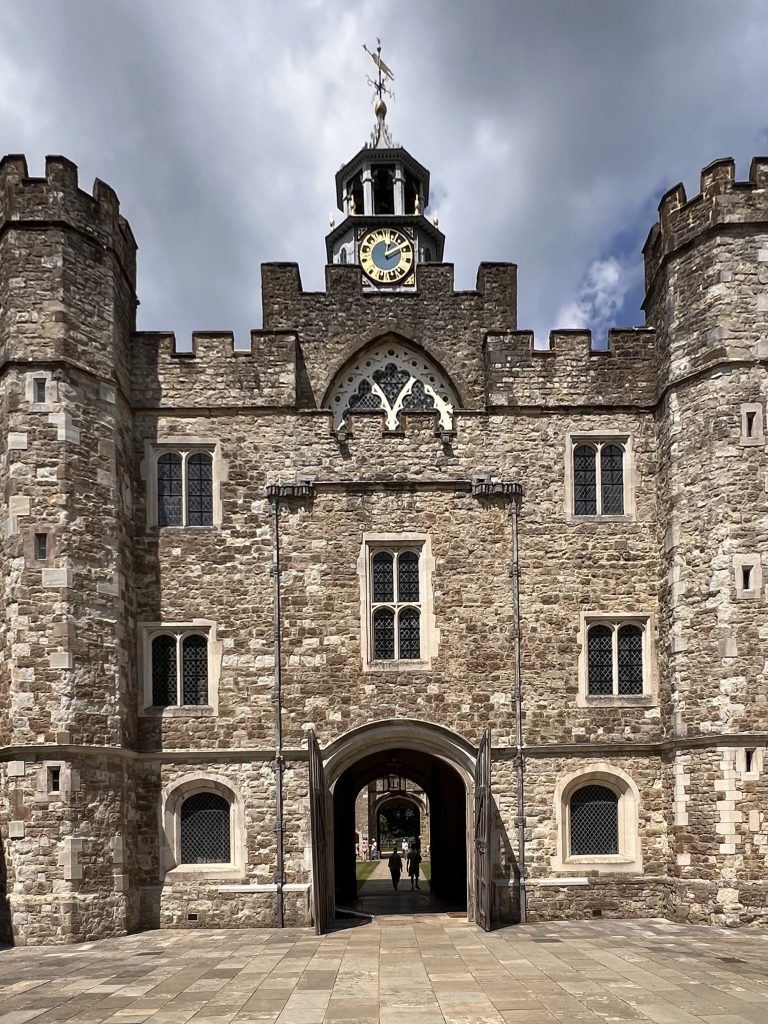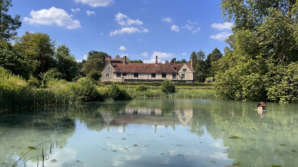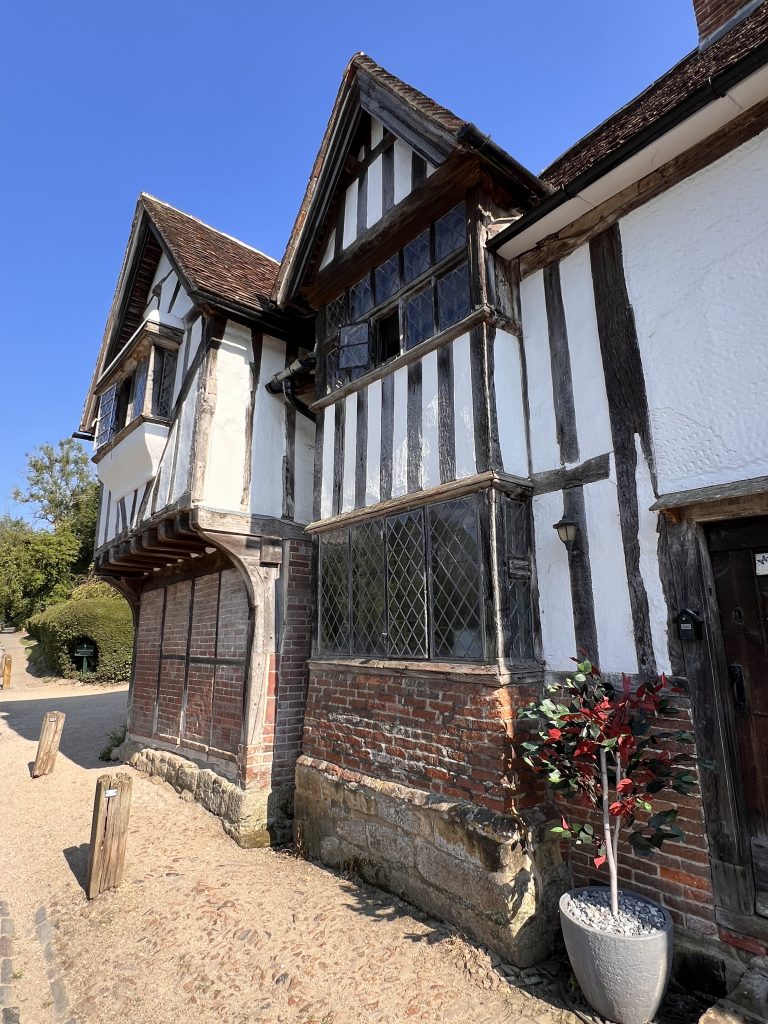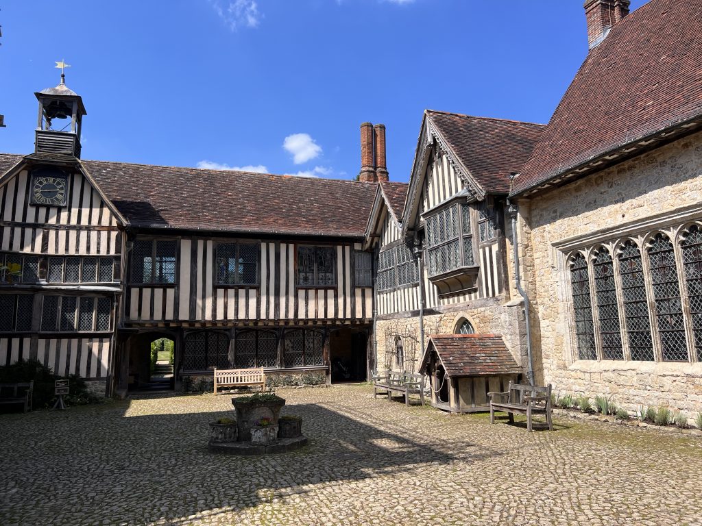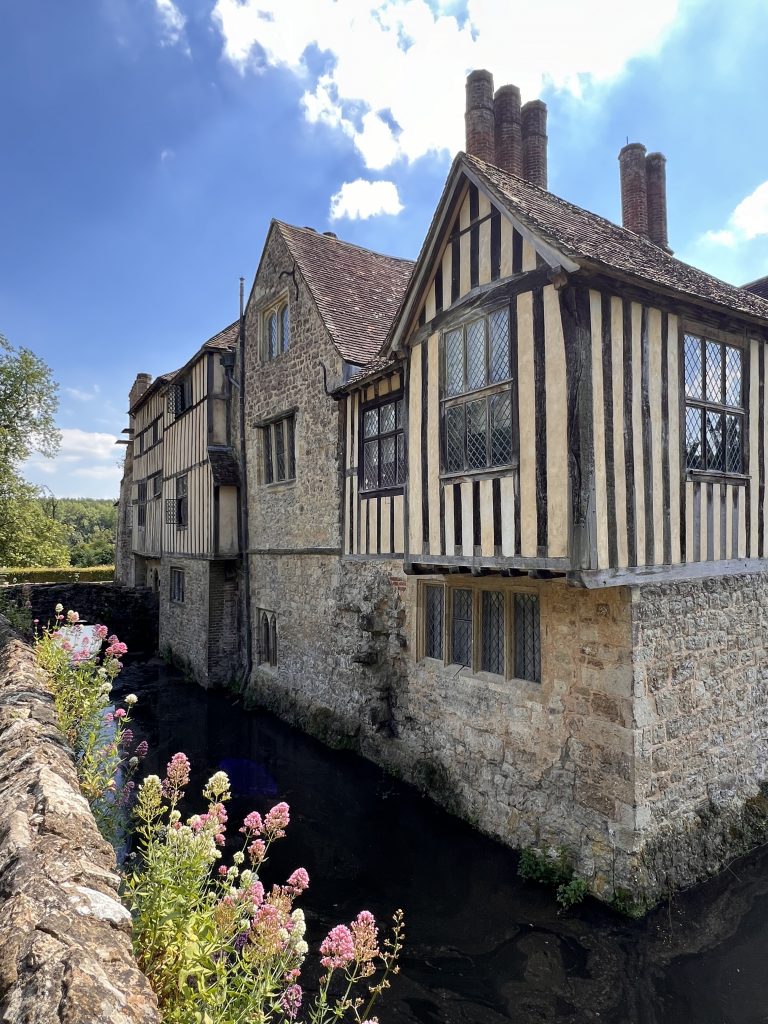 Da die Frau mir an der Ticketbox versprochen hat, das Ziel 1 – Ightham Mote – noch geöffnet hat, versuche ich nun einen zweiten Anlauf und ZUM GLÜCK klappt der auf verschlungenen Wegen. Lunchen suche ich einen Platz im Schatten vor dem Tor mit einem Schüsselchen Wasser und einer freundlichen Einlassfrau daneben. Jetzt kann ich ZUM GLÜCK auch noch einen Blick auf dieses Schmuckstück erhaschen.