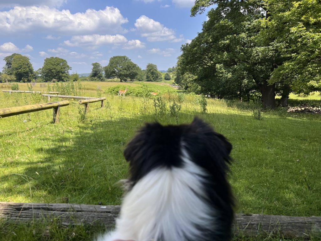 Genug erfahren und angeschaut. Jetzt ist Luna wieder dran. Wir machen uns auf den Weg durch den wunderschönen Landschaftspark und auch wenn es die Sonne gerade wieder sehr gut meint: ich hab ja ZUM GLÜCK einen wunderbaren Sonnenhut. Lunchen ist zwar ganz neugierig auf die vielen Rehe, aber solange keins wegläuft scheint sie ganz entspannt. Ab und zu ist ihr typisches Piepsen zu vernehmen, aber im Großen und Ganzen schlägt sie sich tapfer und meistert die Herausforderung gut. Nur bei den Häschen, da ist kaum ein Halten.