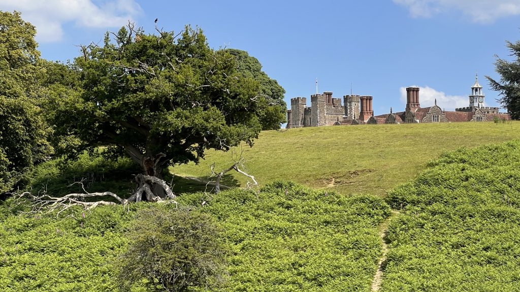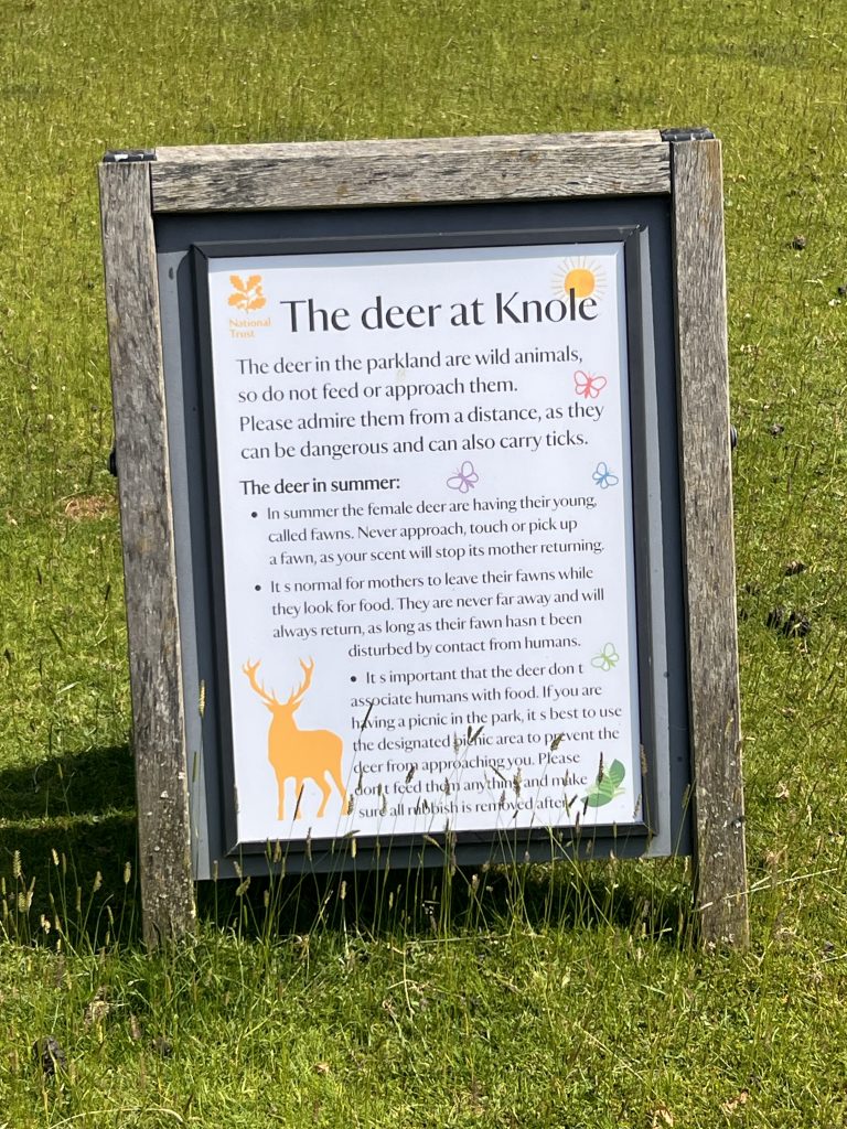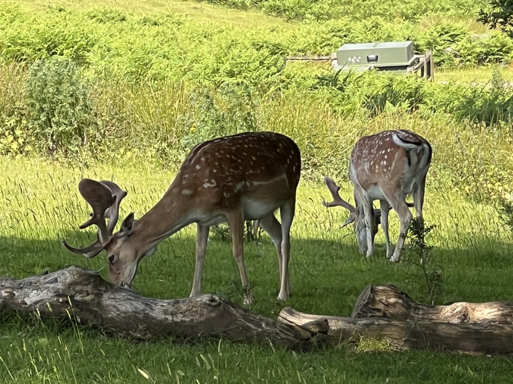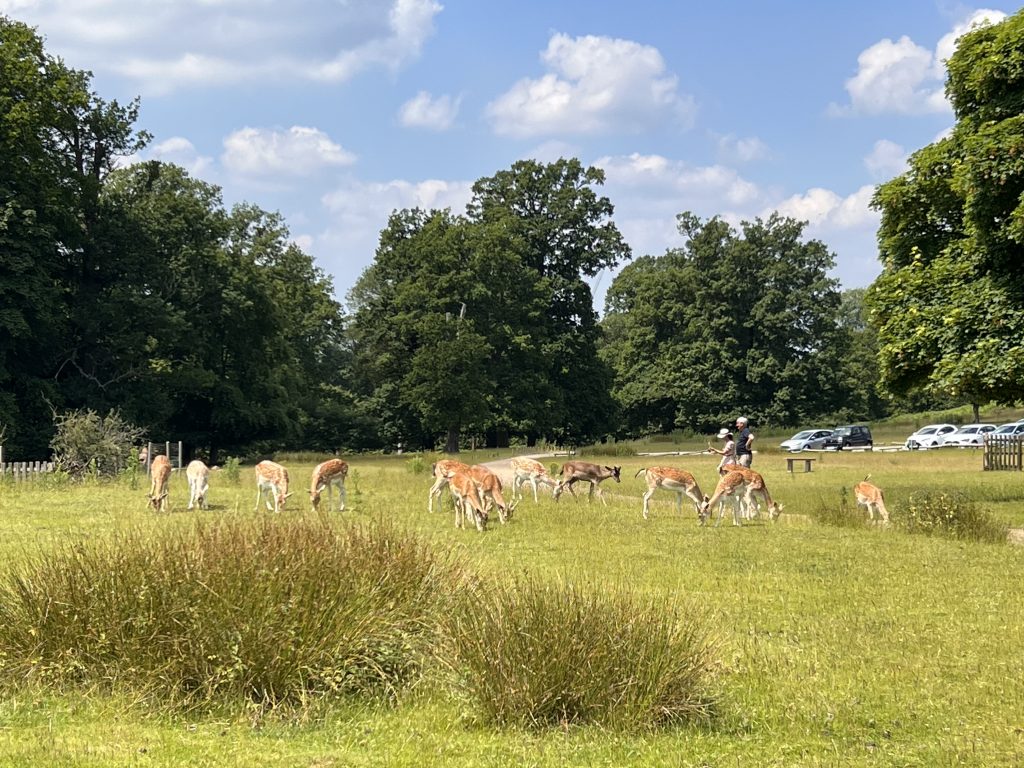 Das erste was hier auffällt: herrliche weite Parklandschaft mit Damwild, wie aus dem Bilderbuch. Hirsche mit schaufeligen Geweihen, Kühe und Kitze, alle helbraun mit weißen Tupfen – unzählig viele und ziemlich zahm. Auf Schildern wird man hingewiesen, dass man nicht füttern soll und sie in einem gewissen Sinn noch „wild lassen“ soll.