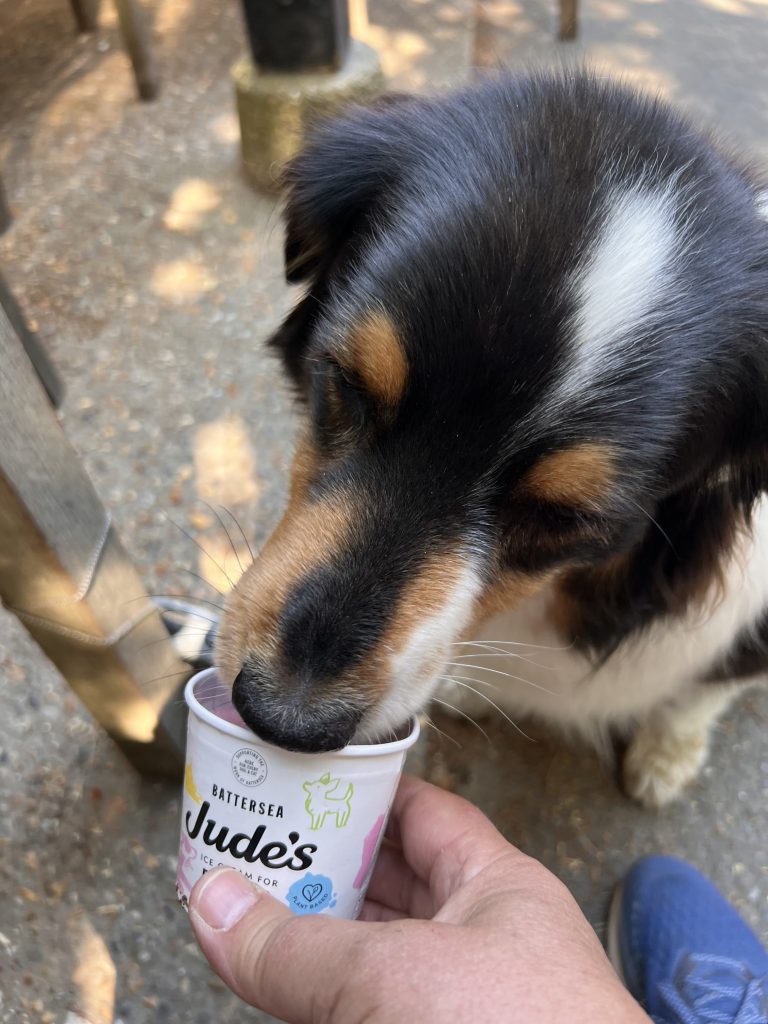 Die große Hundehütte ist übrigens auch in die Liste der erhaltenswerten Baudenkmäler aufgenommen und nach dem Rundgang gönne ich mir einen Kaffe und Luna bekommt das Highlight des Tages: Hunde-Eis.