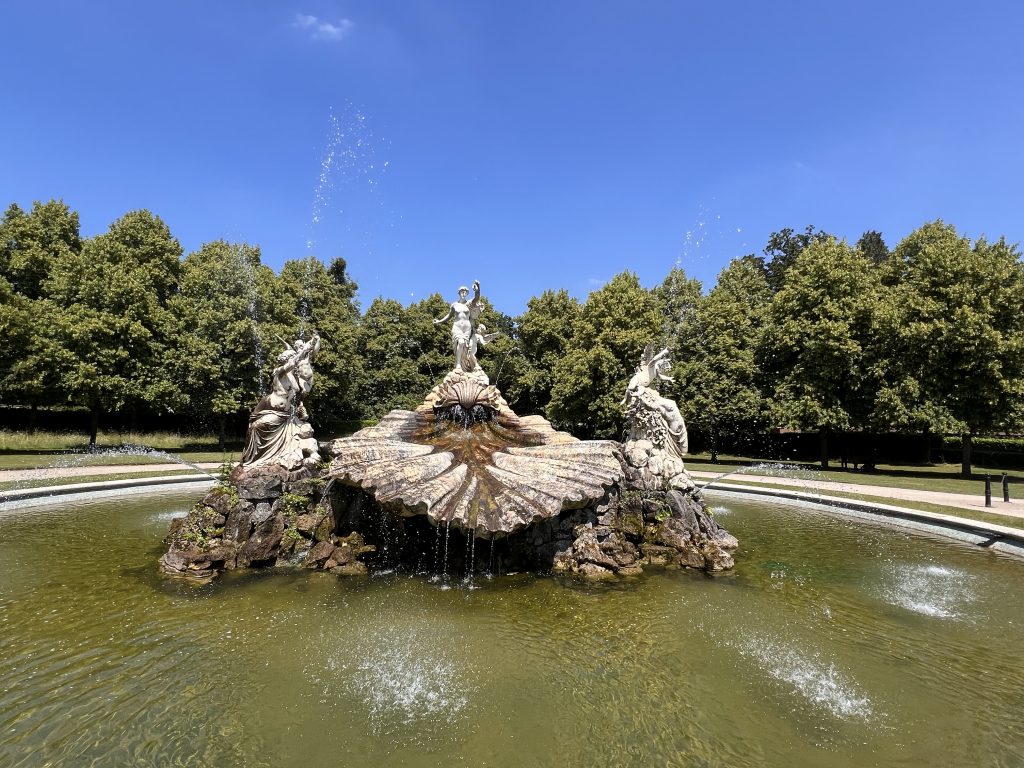 Hier herrscht kein buntes Gewimmel, es überwiegen die langen Blickachsen, die weiten Areale, das beruhigende Grün in Kombination mit plätscherndem Wasser. Ruhe, Besinnung sind angesagt und wenige Besucher finden diese auf den langen Wegen und zahlreichen Parkbänken. Aber auch kleine Details sind zu entdecken.