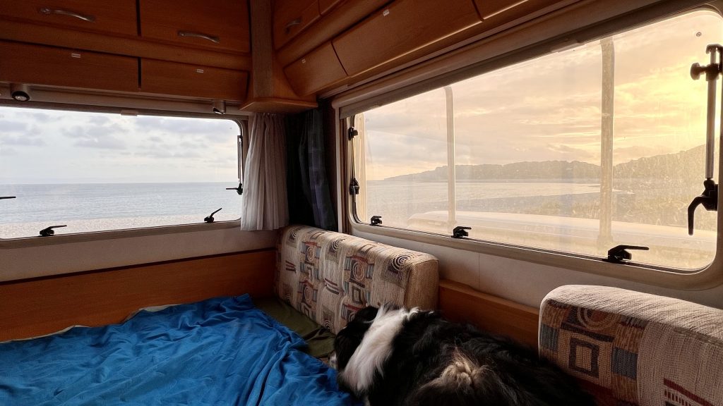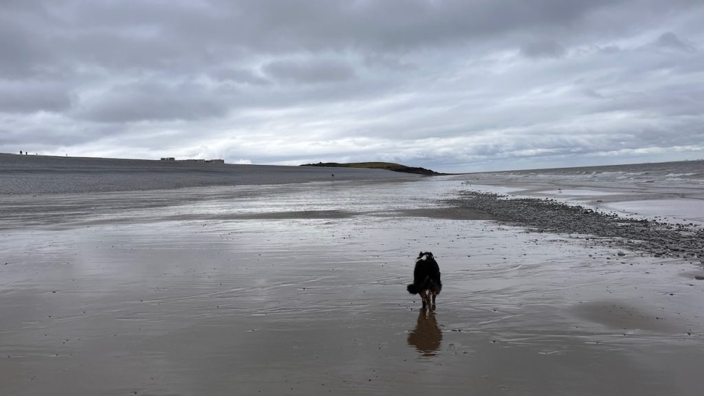 Aber bei dem Sauwetter ist das ja wohl auch nicht so schlimm. Wir lassen uns Zeit, trainieren ein bisschen morgendliches Beruhigen im Womo – was mit einem ziemlichen Berg Leckerli auch ganz gut gelingt und dann drehen wir – bei nachlassendem Sprühregen – eine wunderschöne Runde am Strand.