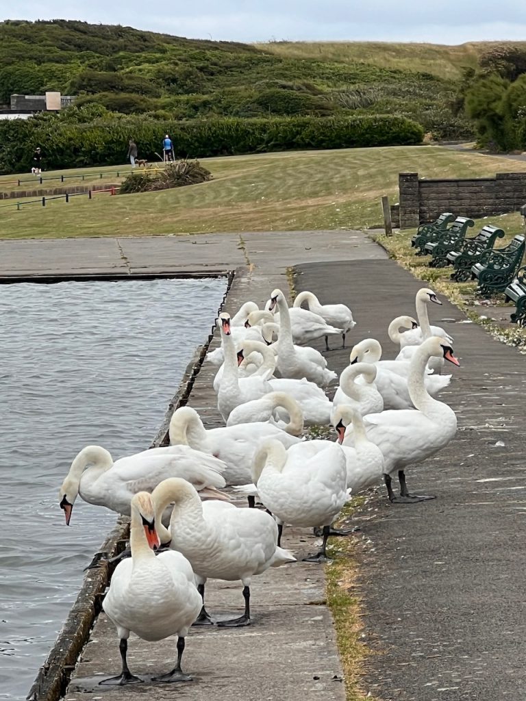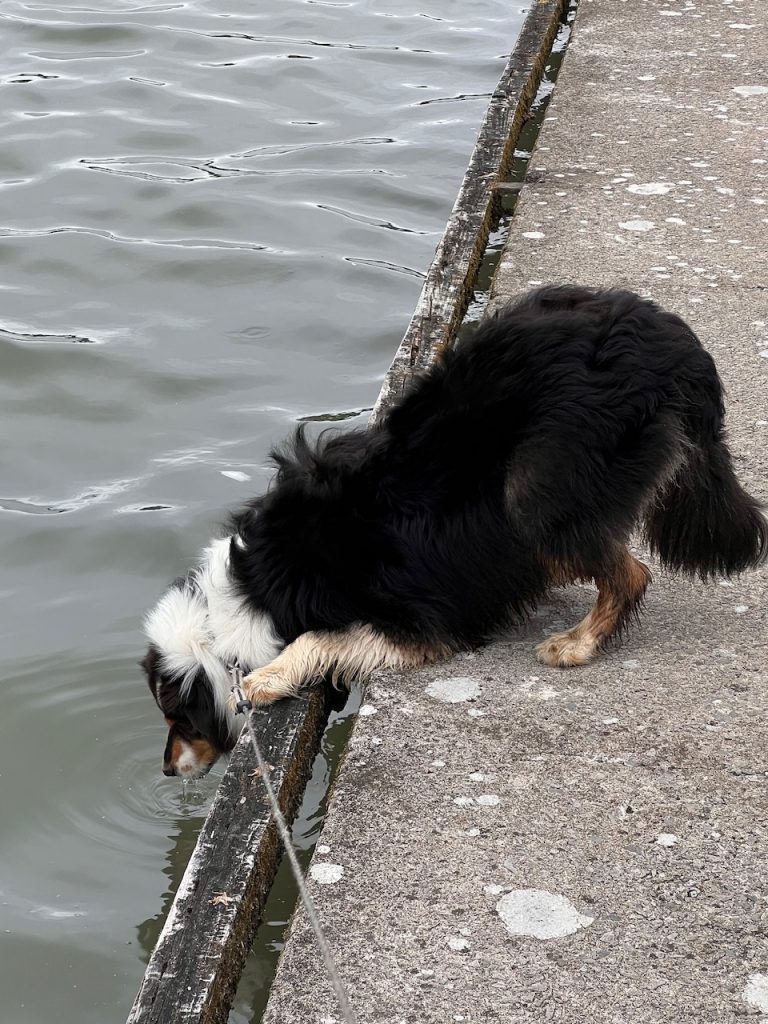 Die Ebbe hat Sandbänke freigelegt und so müssen wir nur kurz über die dicken Kiesbänke. Luna ist fröhlich und entspannt, jagt Möwen und sogar auf einen Schwan ist sie draufgehopst, aber der scheint das gewöhnt zu sein und schüttelt sie einfach ab.