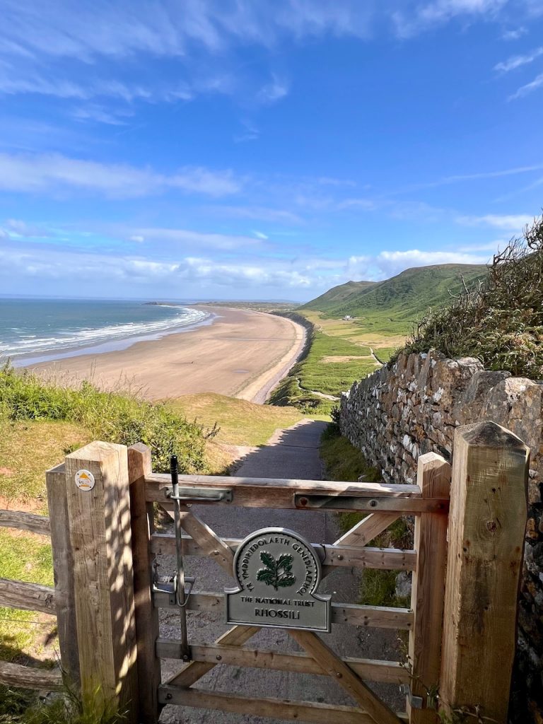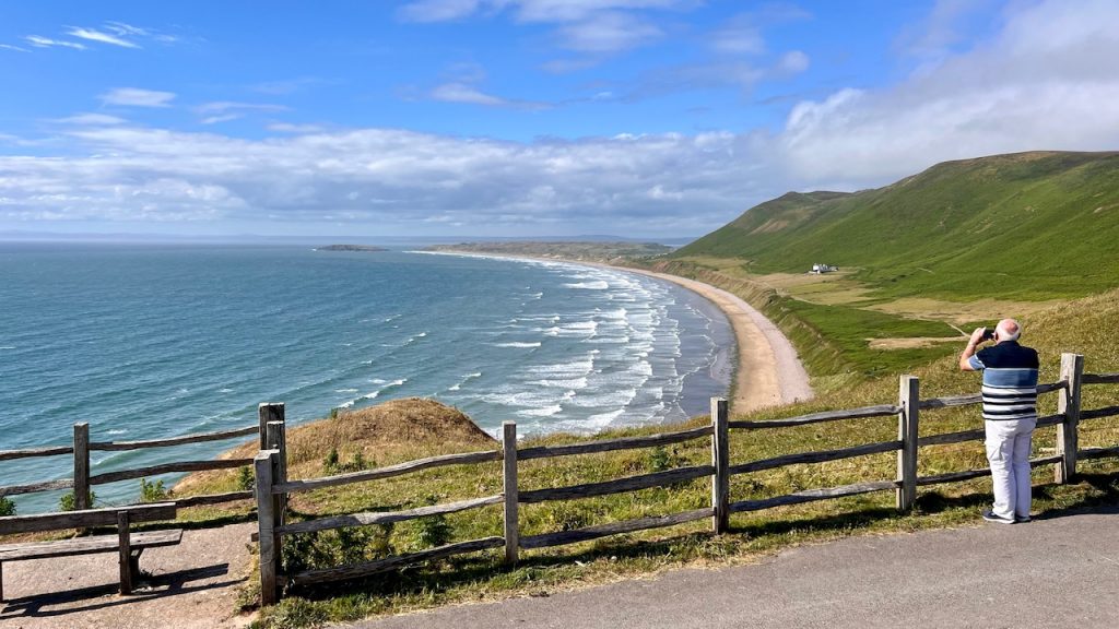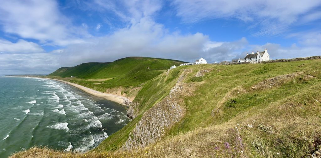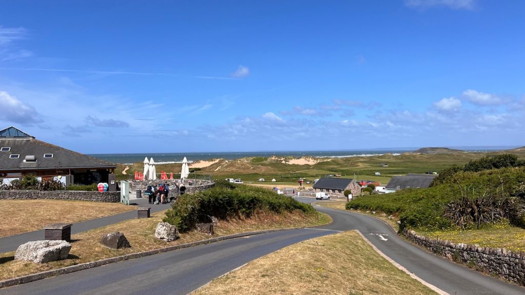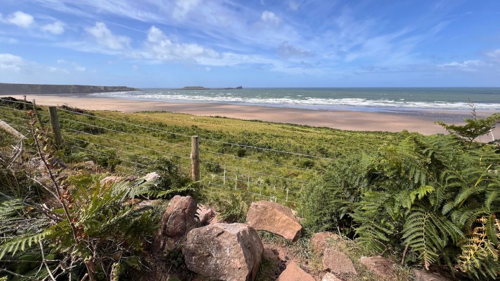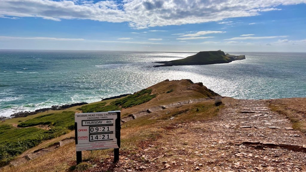 Über enge Straßen schaukeln wir auf die westliche Landzuge der Halbinsel zu. Das kleine Örtchen Rhossili bekommt an guten Tage ganz schön viel Besuch, denn es ist wunderschön hier und der National Trust hat hier einen großen, grünen Car Park mit vielen Picnic Arealen und einem kleinen Shop gebaut. Das ist der Ausgangspunkt zur kurzen und atemberaubenden Wanderung zum Worm`s Head, also Drachen-Kopf. Und tatsächlich sieht es aus, als ob da im Wasser der alte Walisische Drache gerade abtaucht. Aber bevor wir dort ankommen, gibt es nach rechts und links noch ein paar fantastische Aussichten, zu denen es wirklich nicht so viel zu sagen gibt außer: Wow!