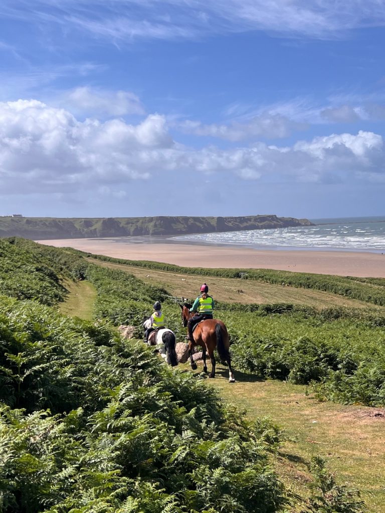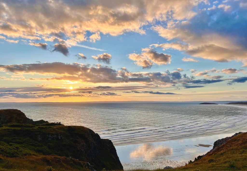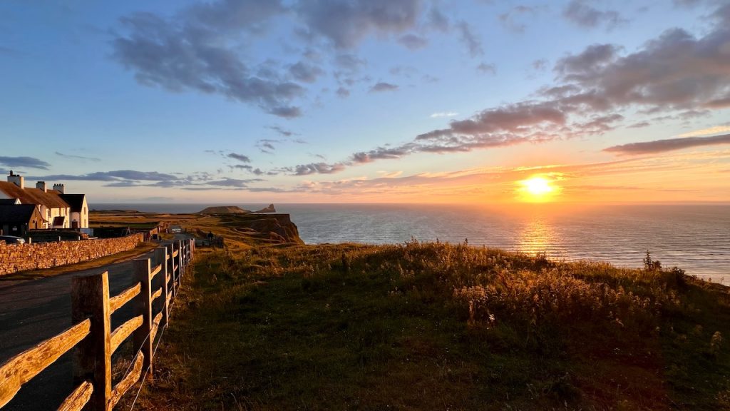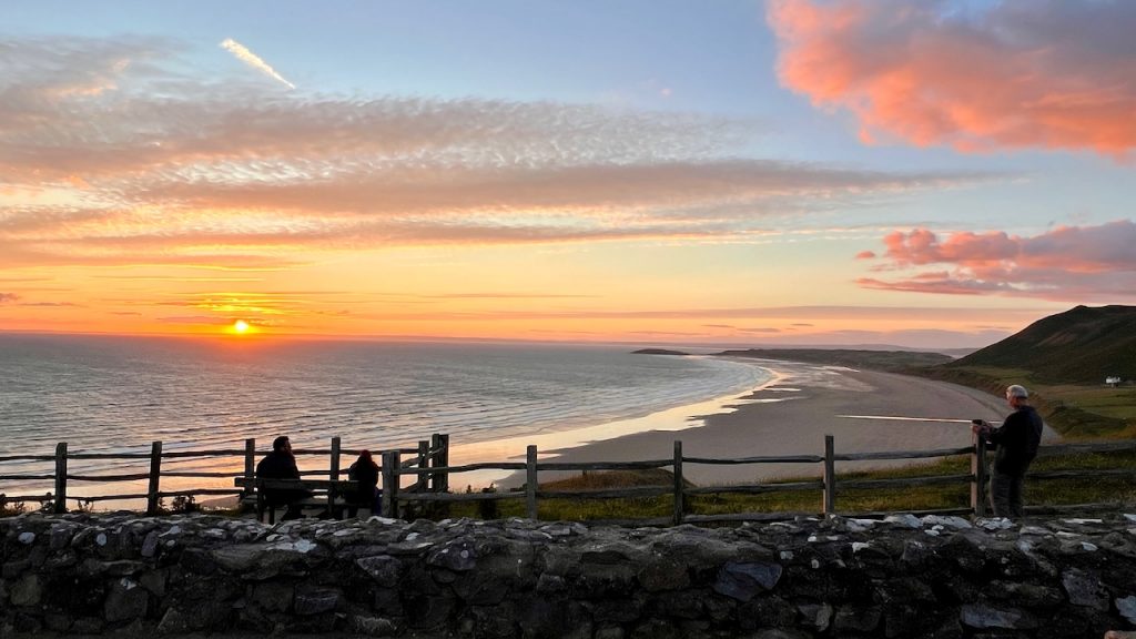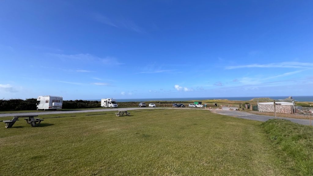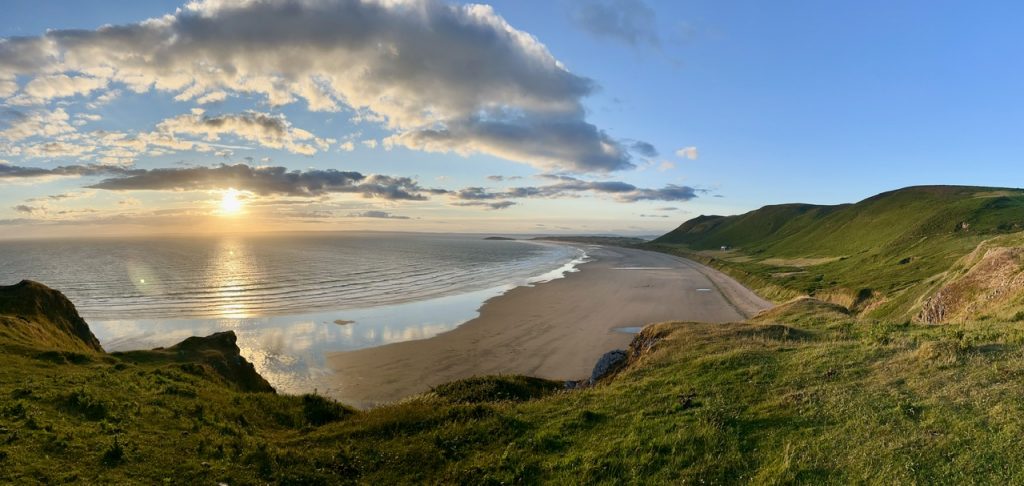 Über enge Straßen schaukeln wir auf die westliche Landzuge der Halbinsel zu. Das kleine Örtchen Rhossili bekommt an guten Tage ganz schön viel Besuch, denn es ist wunderschön hier und der National Trust hat hier einen großen, grünen Car Park mit vielen Picnic Arealen und einem kleinen Shop gebaut. Das ist der Ausgangspunkt zur kurzen und atemberaubenden Wanderung zum Worm`s Head, also Drachen-Kopf. Und tatsächlich sieht es aus, als ob da im Wasser der alte Walisische Drache gerade abtaucht. Aber bevor wir dort ankommen, gibt es nach rechts und links noch ein paar fantastische Aussichten, zu denen es wirklich nicht so viel zu sagen gibt außer: Wow!