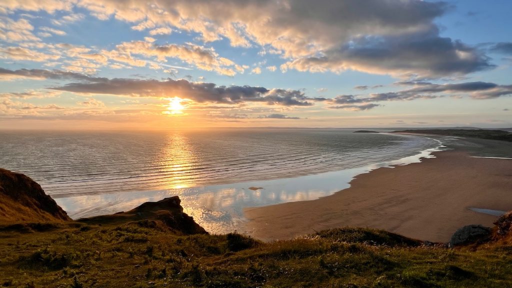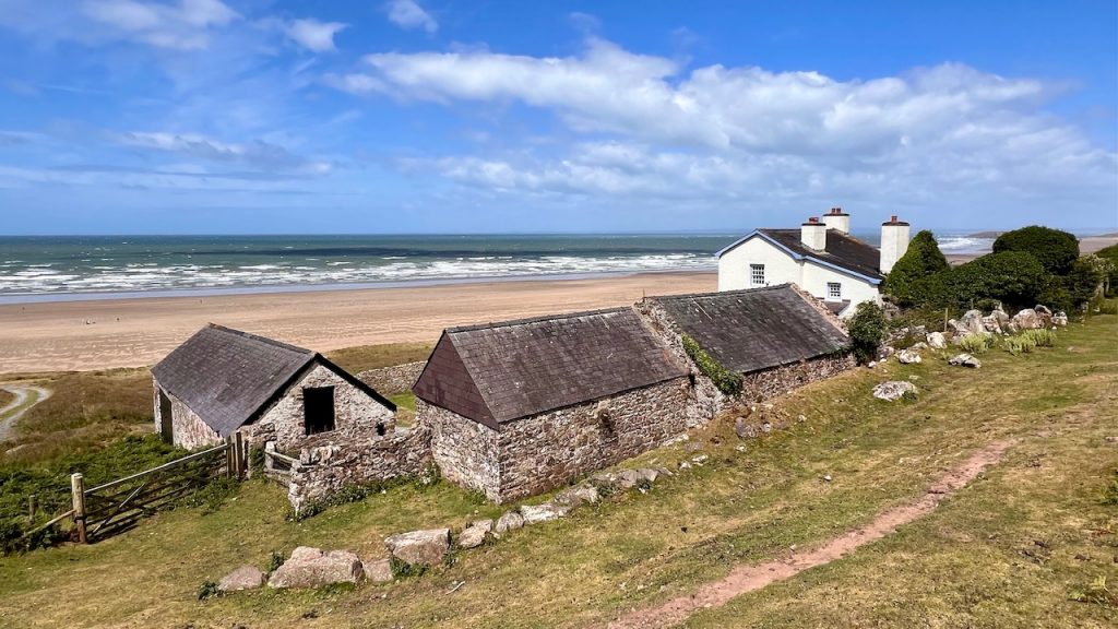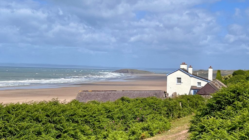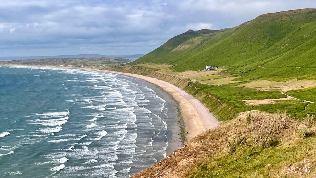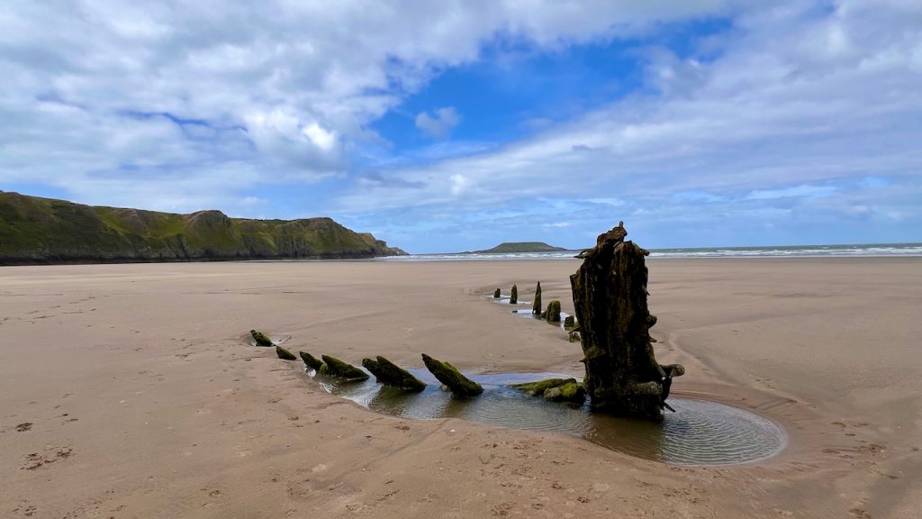 Die Rhossili Bucht erstreckt sich über die halbe Länge der Westseite der Halbinsel und sieht mit der Gischt der heran rollenden Wellen fantastisch aus. Ein einsames kleine Gehöft gibt dem ganzen noch einen besonderen Charme und ein bisschen erinnert mich der Ausblick Schottland. Auf der linken Seite der Bucht läuft der Wanderweg zur Landzuge entlang und da liegt er im glitzernden Wasser, der alte Drachen. Sein Schwanz ist ganz von Wasser bedeckt, aber bei Ebbe kann man über ihn hinweg trockenen Fußes das Schuppentier erklimmen.