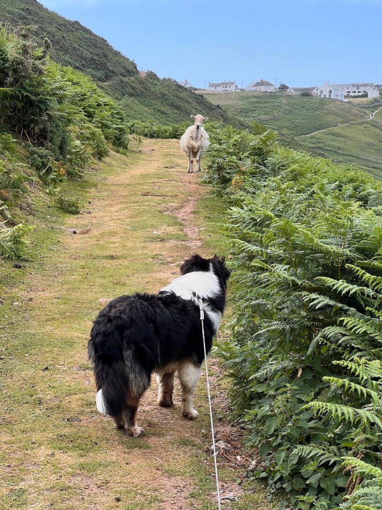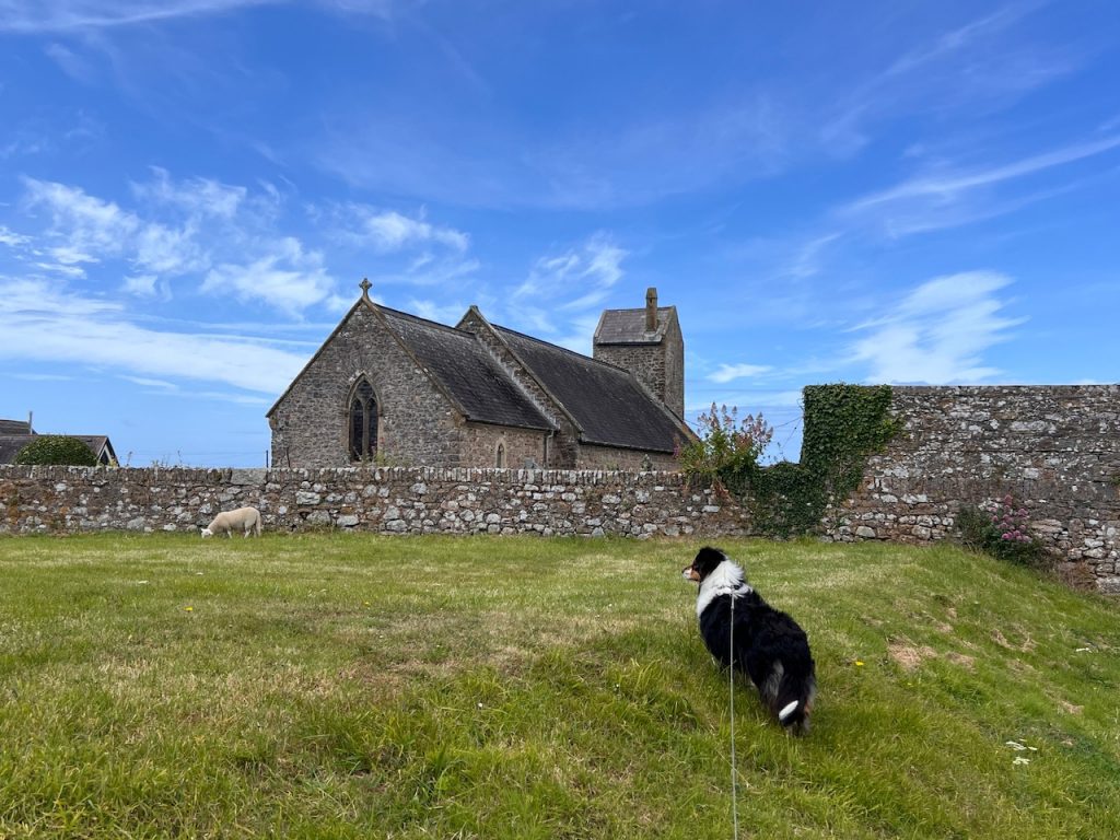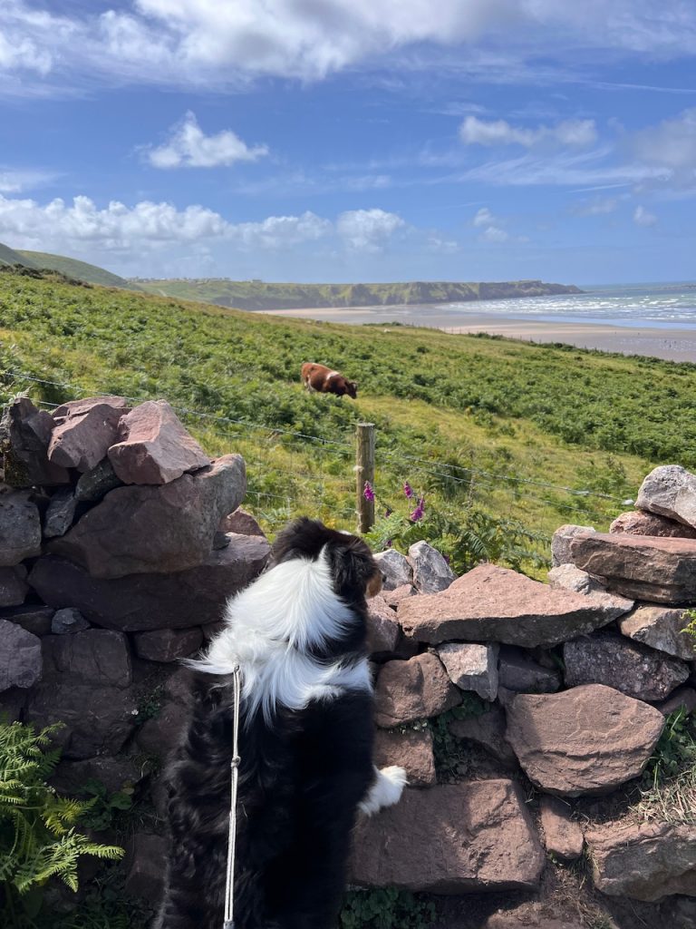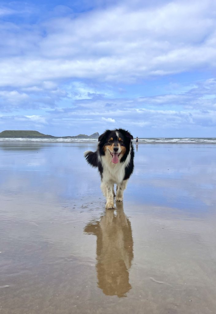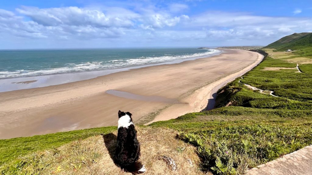 Heute steht die Wanderung um den Rhossili-Down, den kleinen Hügel am Strand an. Wir starten am Wasser und laufen am Hügel zurück. 5km reinster Sandstrand liegen vor uns und Luna hüpft fröhlich ihrem Ball hinterher. Als dieser dann im Rucksack verschwindet, findet sie es hier aber ziemlich langweilig. Nix zu schnüffeln, andere Hunde darf man nicht belästigen… was soll sie nur auf diesem riesigen Sandstück, das noch nass von den zurückfließenden Wassermassen ist?