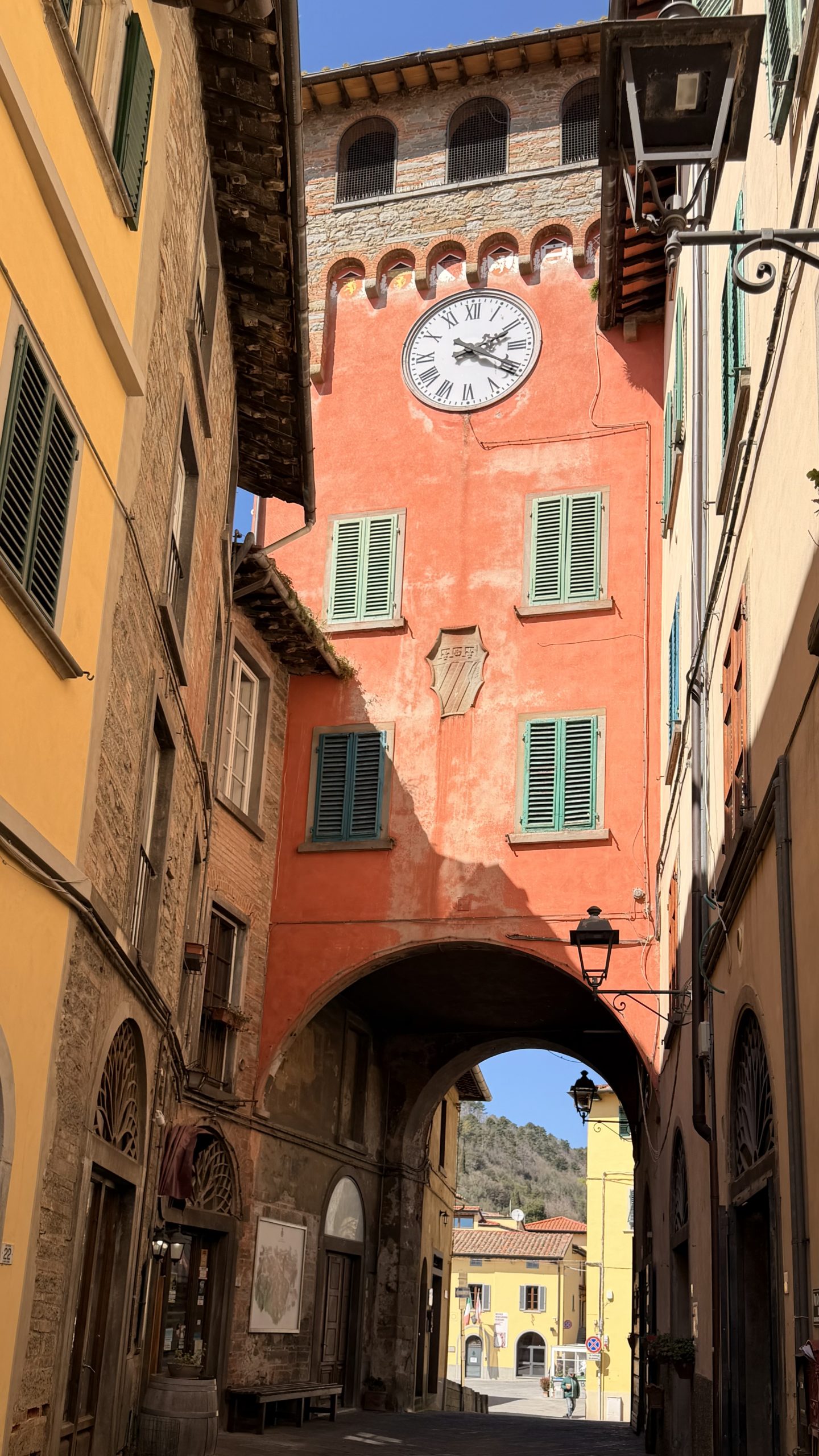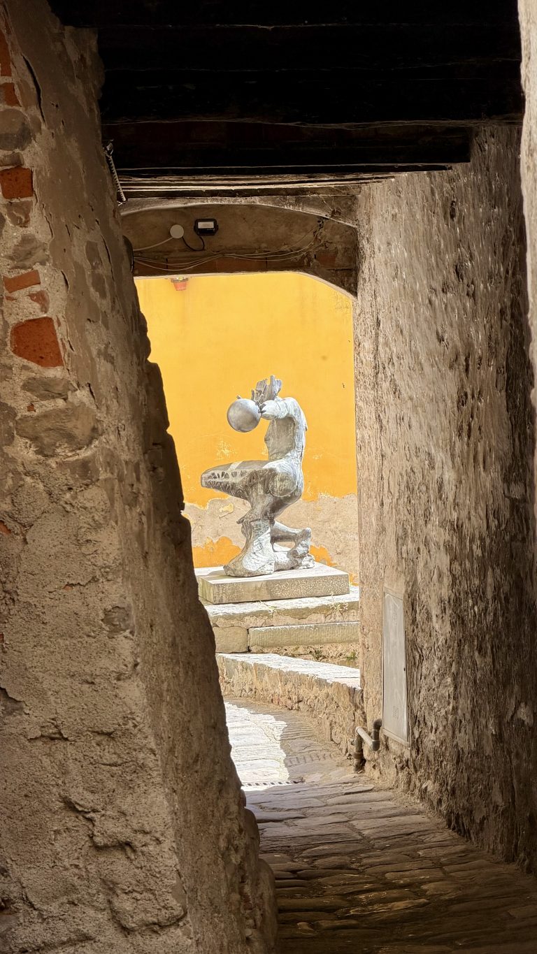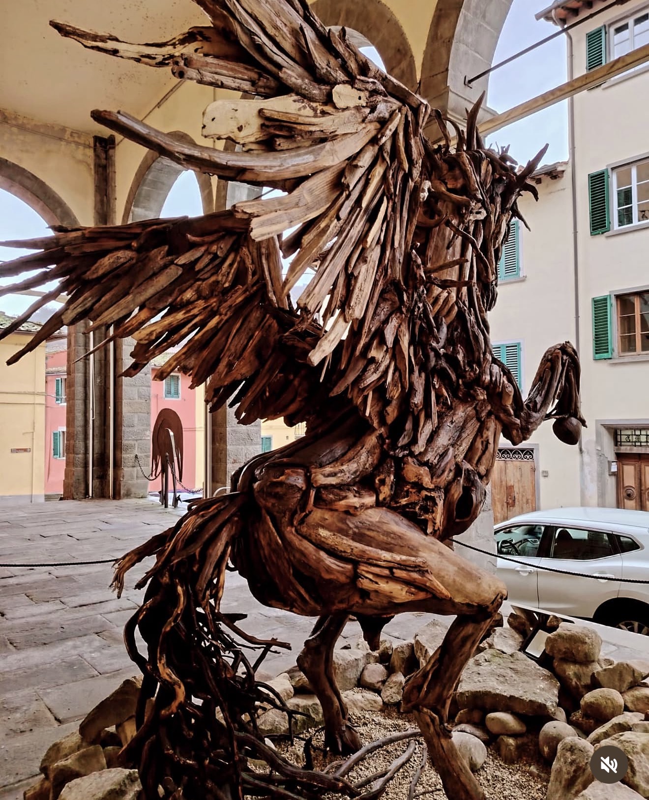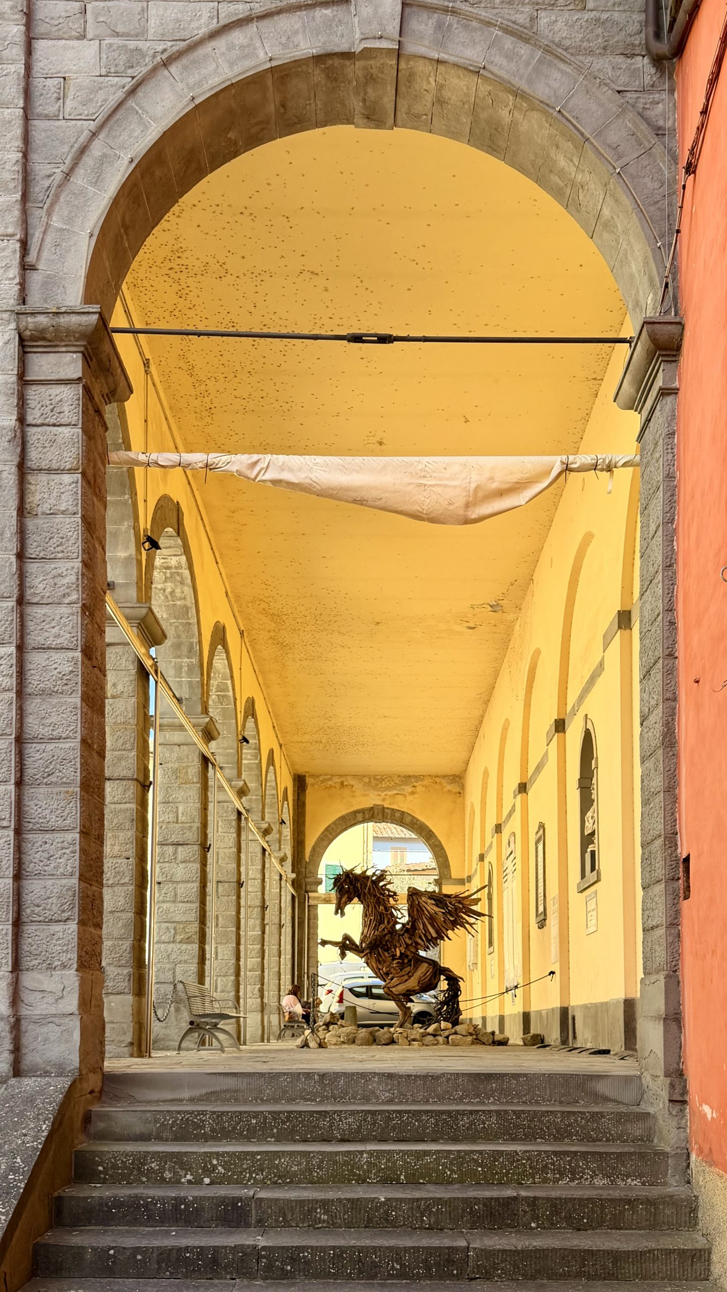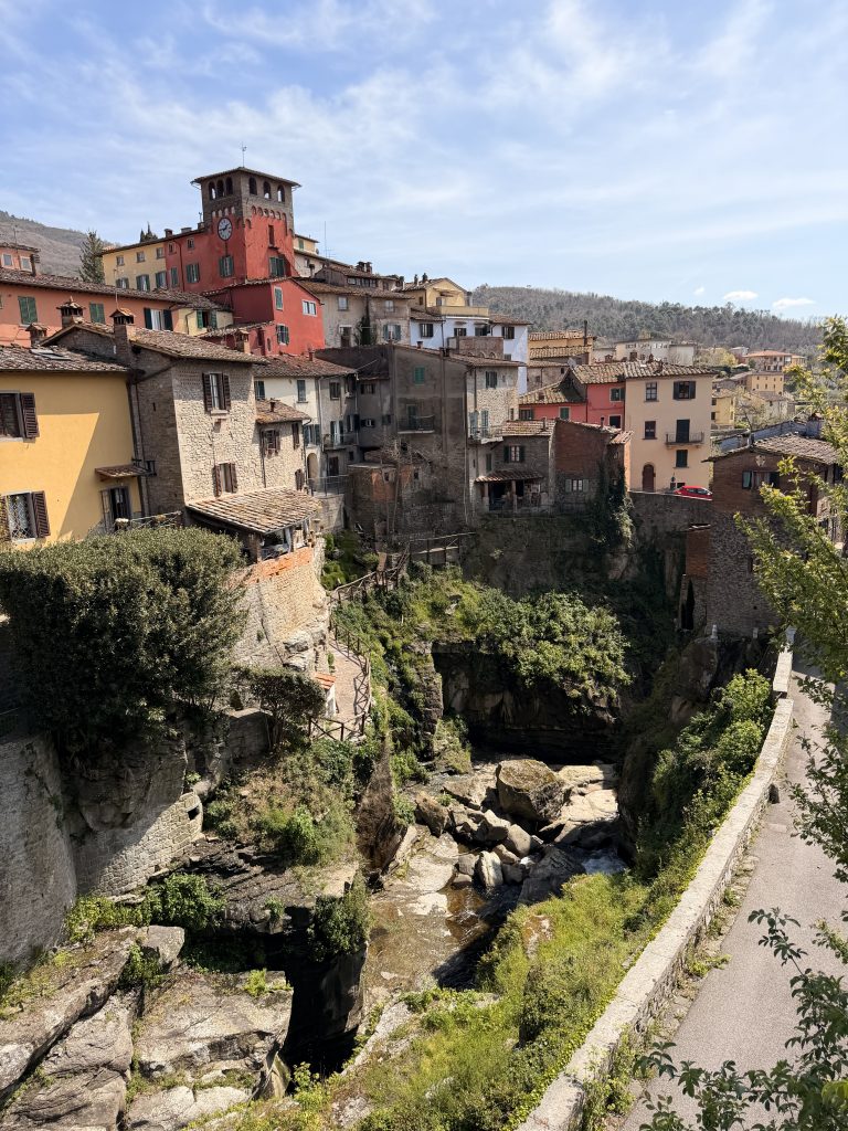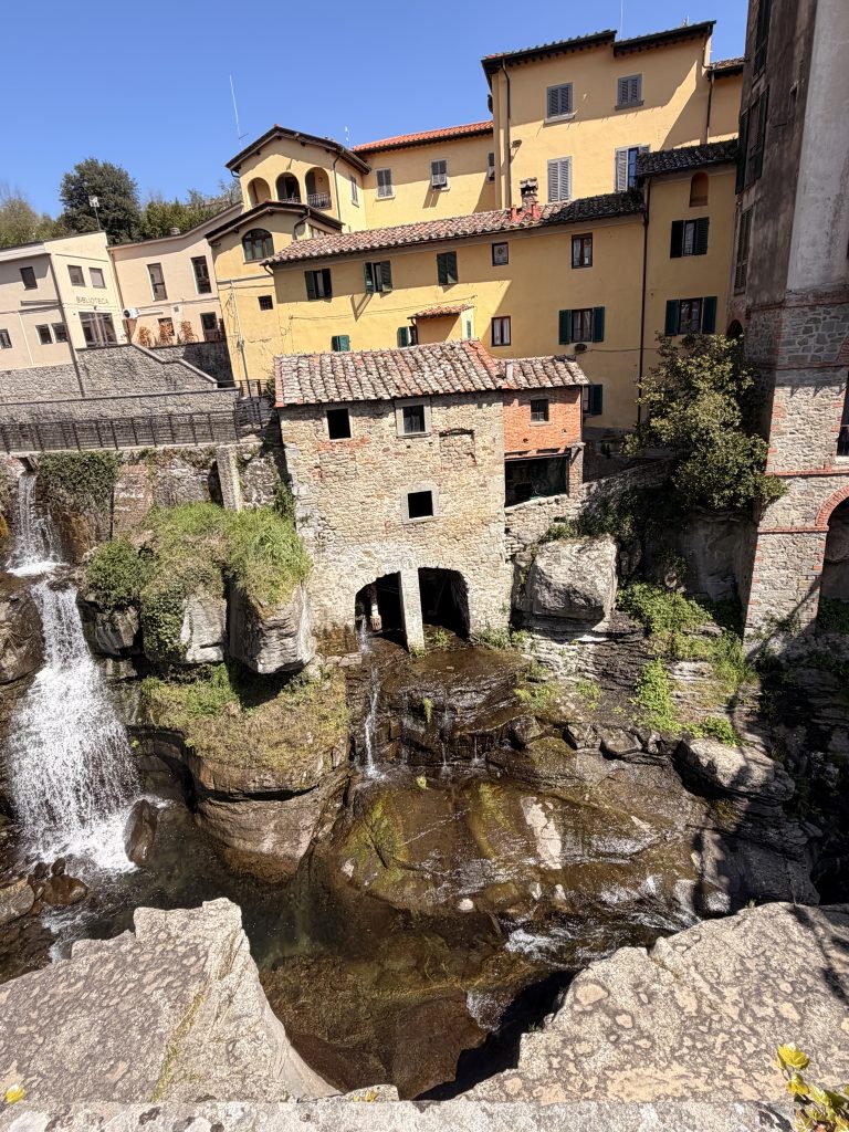 Am Nachmittag ist es zu windig, um im Garten zu chillen und so machen wir uns dann doch mit dem Auto auf einen kurzen 8km-Weg nach Loro Ciuffenna. Der Titel „Borghi piu belli dÌtalia“ (eines der schönsten Dörfer Italiens) lässt Großes hoffen und ich werde nicht enttäuscht: Der Wildbach Ciuffenna strömt mitten im Örtchen durch eine dramatische Felsschlucht. Ringsherum drängen sich wie angeklebt die Häuser und man erkundet die Stadt durch verwinkelte Gässchen und über hohe Brücken. Am Ufer des Baches steht die älteste Getreidemühle der Toskana aus dem 12.Jahrhundert und auch der Glockenturm mit angeschlossener Loggia aus dem 14.Jahrhundert sind sehenswert. In der Loggia hat der Künstler Andre Iron erst im März eine Pegasus Skulptur aus Treibholz installiert. Und das überhaupt Allerbeste: KAUM TOURISTEN
