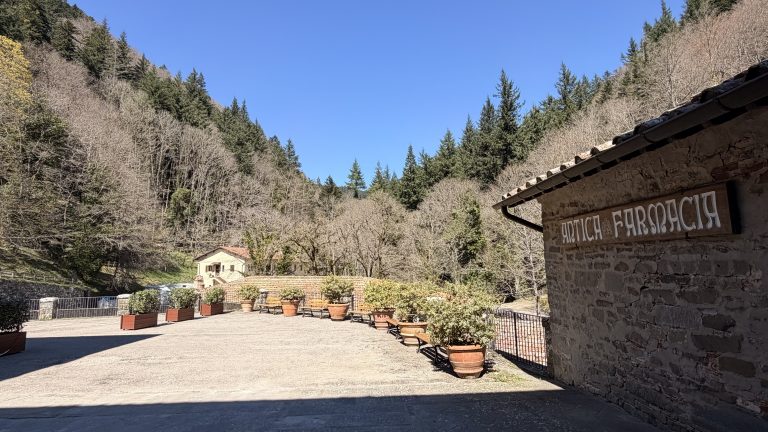 Gemächlich fahren wir durchs Arnotal und hinauf zum Nationalpark Foreste Casentinesi. Das Kloster der Kamaldulenser-Mönche ist unser Ziel. Besonders interessiert mich daran die kleine antike Apotheke. Außerdem gibt es 3km weiter den Berg hinauf noch die Einsiedelei Eremo die Camaldoli. Wir kommen also mitten im Wald auf einem kleinen Parkplatz an und ich bin erst einmal sehr begeistert von dem Wanderweg, der sich uns auftut. Also Klappe auf und begeisterte Hundedame raus in die Natur. Das ist schon was anderes als sich durch Bergdörfer zu schleppen. Sie tobt gleich erst einmal los und freut sich über ihr Leben. Neben uns rauscht das Wasser in die Tiefe und so wandern wir ganz allein durch die Schönheit des Nationalparks.