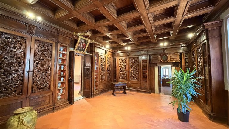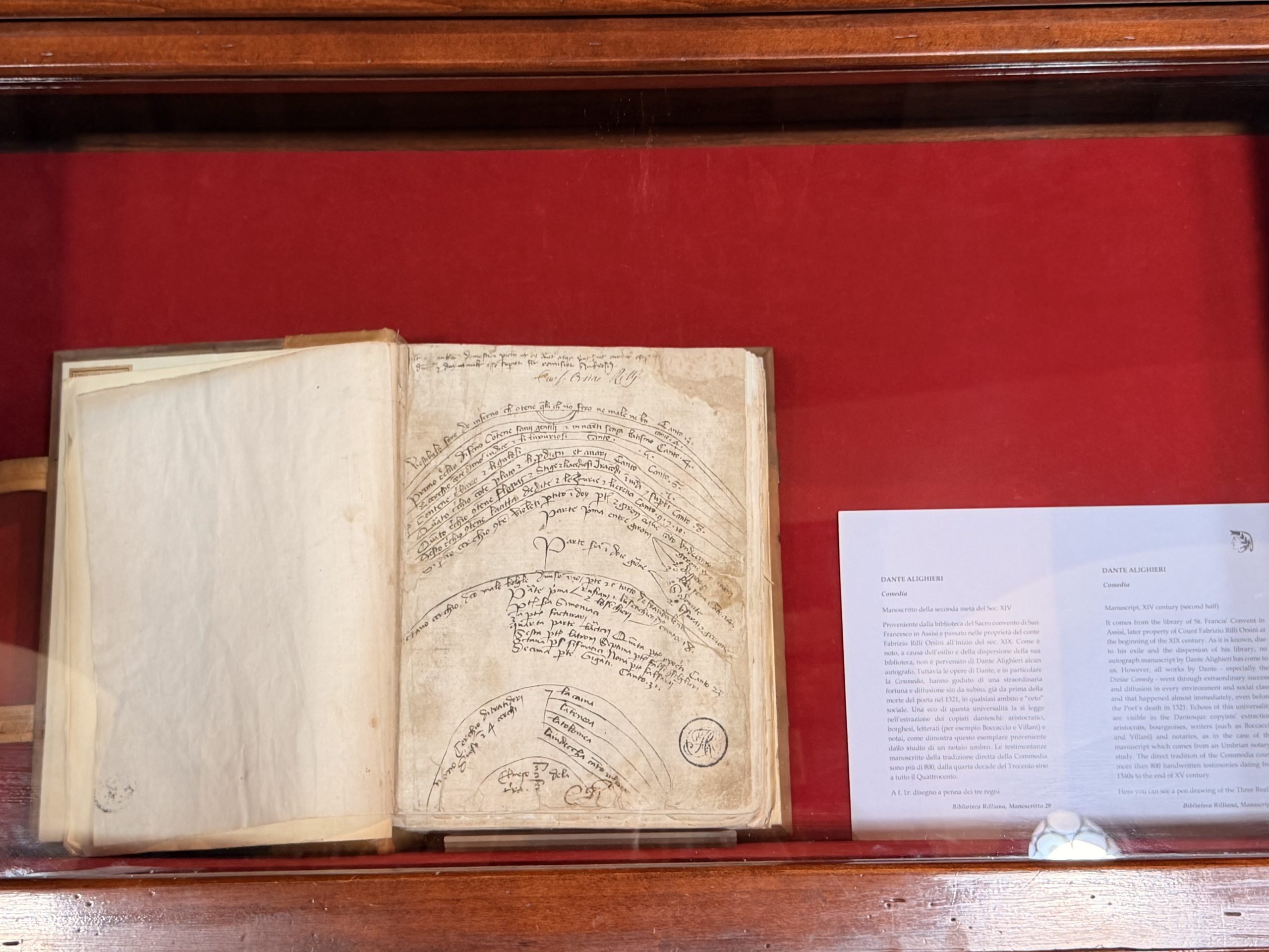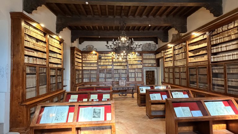 Die alten Bibliothek umfasst fast 30000 Bücher und einige Orginale von Dante sind auch ausgestellt. Kein Wunder, denn der war gern gesehener gast bei denen von Guidi. Der freundliche Student, der hier aufpasst, dass keine Bücher „ausgeliehen“ werden, erklärt mir, dass der letzte Graf der Burg die Bibliothek nach seinem Ableben der Stadt vermacht hat. Viele Bücher sind mittlerweile digitalisiert worden. Von Wisschenschaft und Literatur über Gesetzestexte bis zu philosophischen Abhandlungen ist hier alles zu finden.