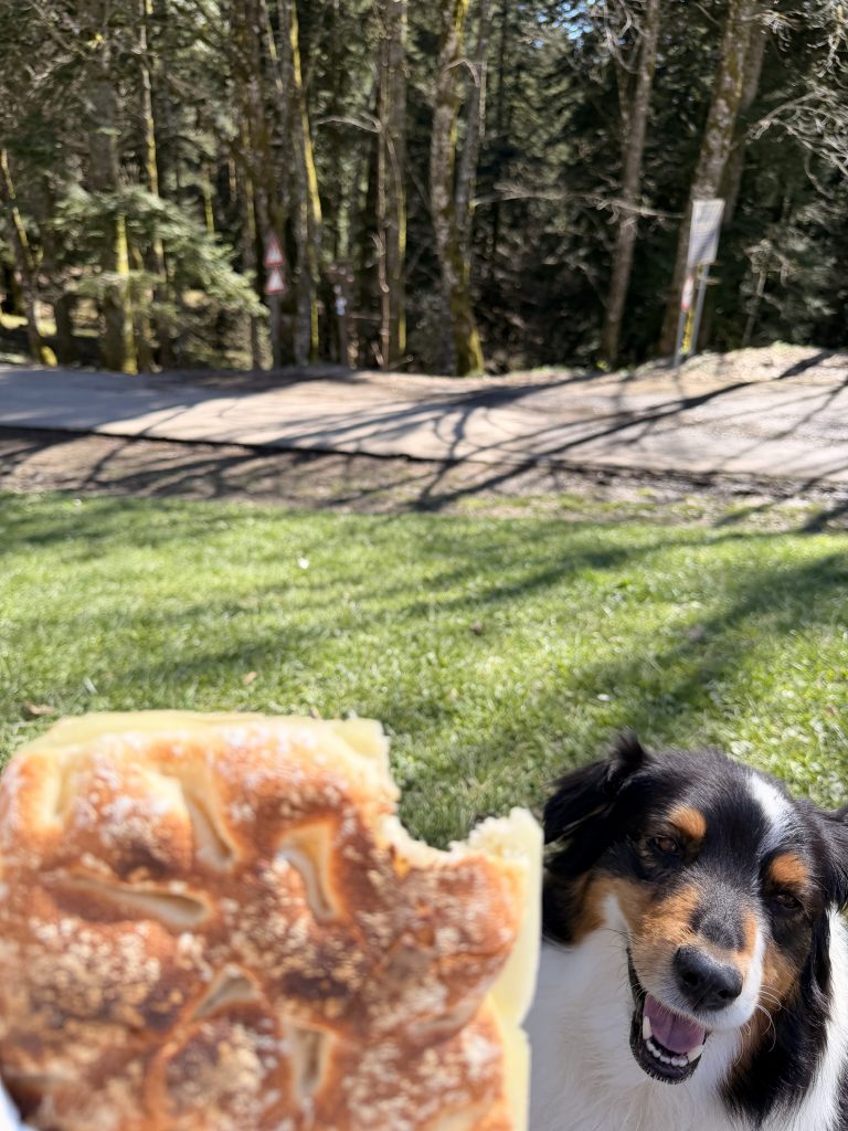 Im dem angeschlossenen Cafe macht mir die nette Verkäuferin ein warmes Käse-Sandwich und einen Cappuccino, den ich in himmlischer Ruhe draußen auf den sonnigen Bank genieße… und Luna bekommt auch was ab.
